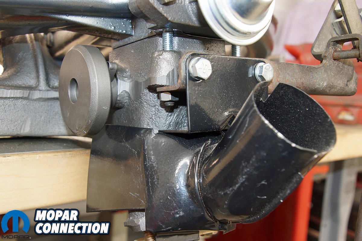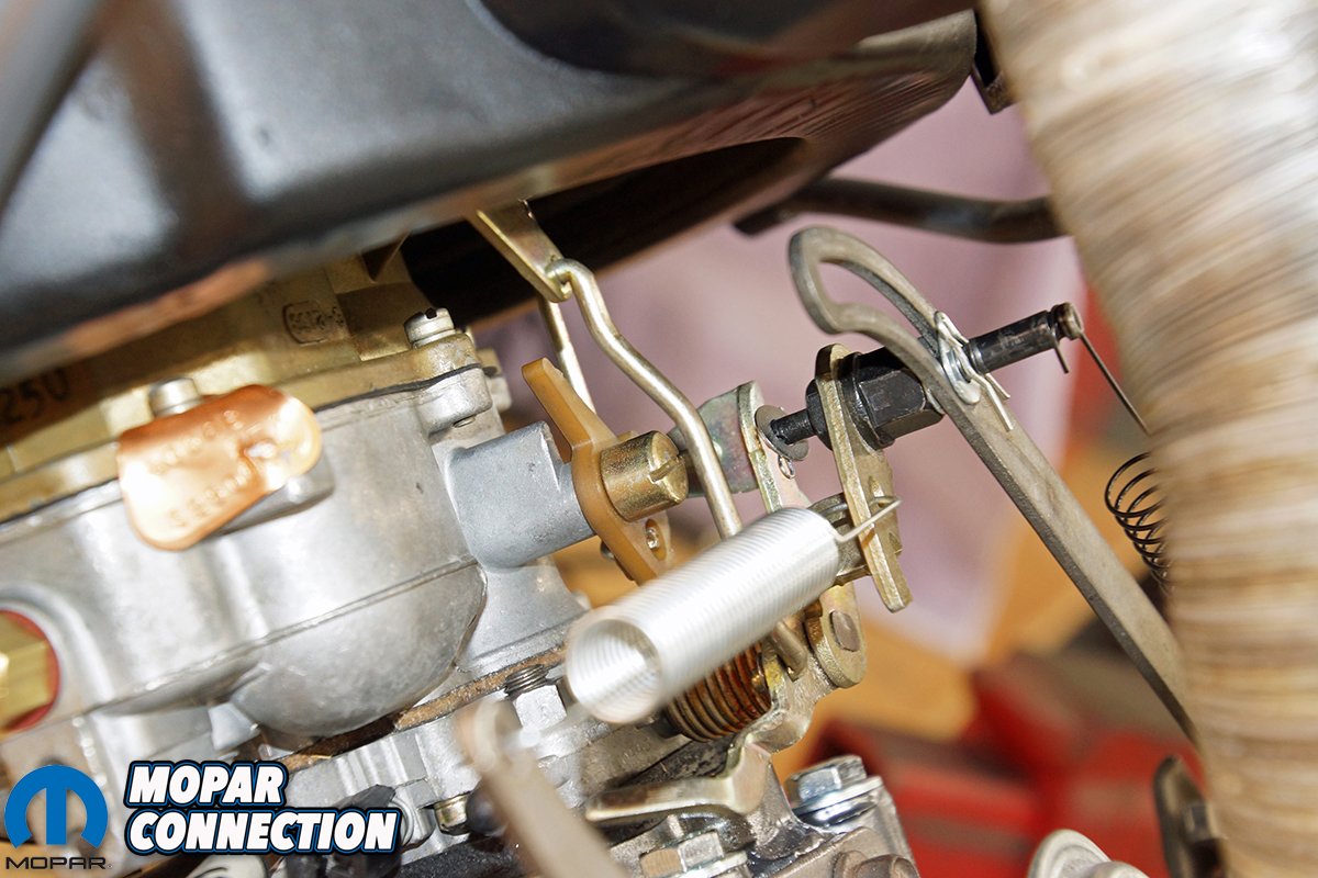 Top Left: The kick-down linkage mounting bracket was attached to the exhaust manifold with studs and nuts. Top Right: The 1967 Dart’s air cleaner housing did not have a provision for the heater ducting, but we wanted to use the Super Six factory parts, so we installed the carb air heater. Bottom Left: The slotted kickdown lever was attached to the carburetor throttle arm shaft. Bottom Right: Another angle of the kick-down lever shows the spring and clip arrangement.