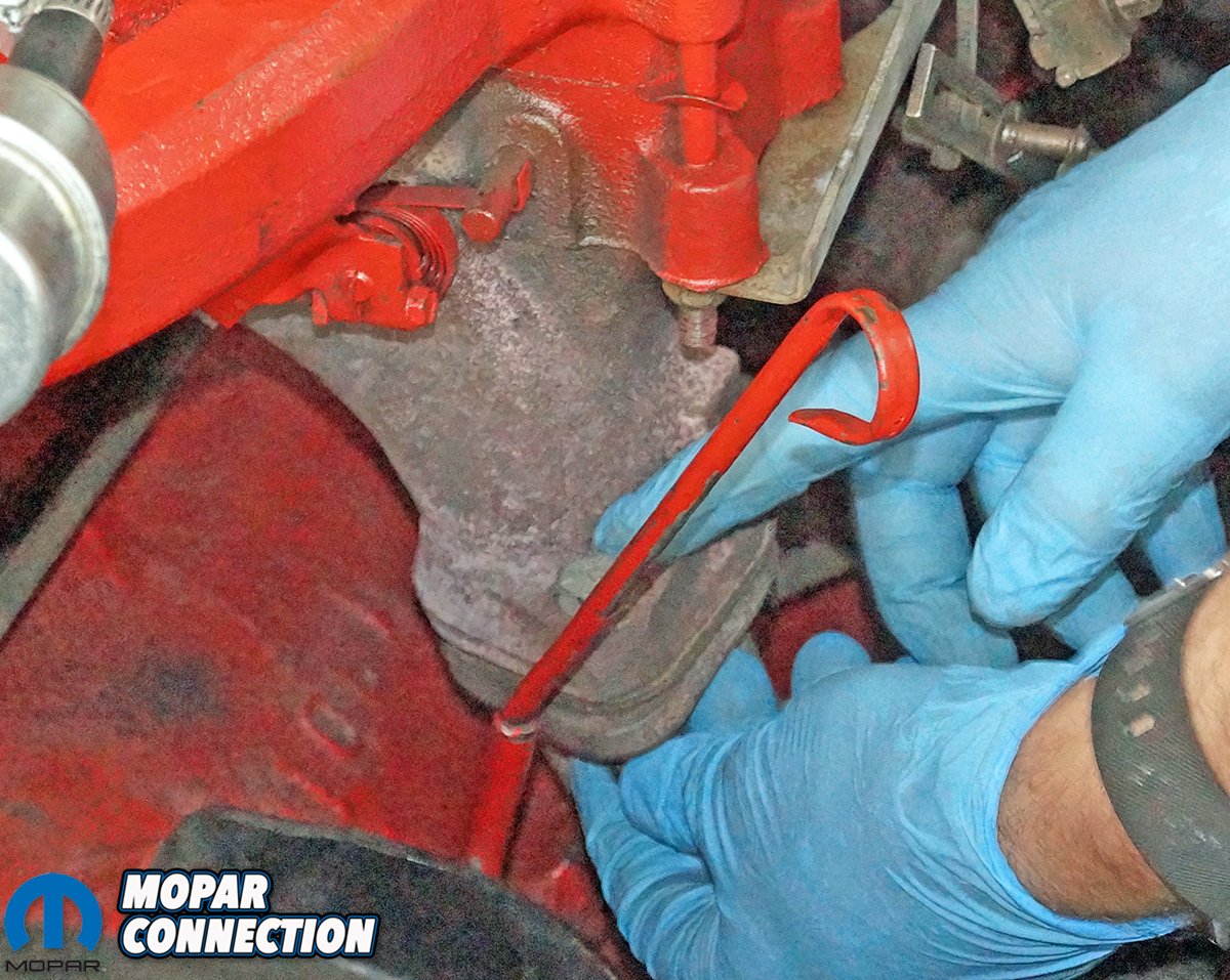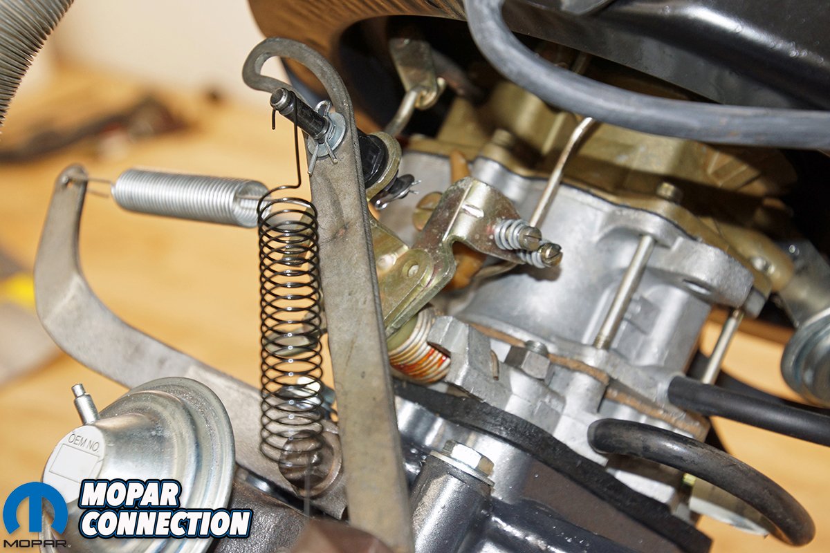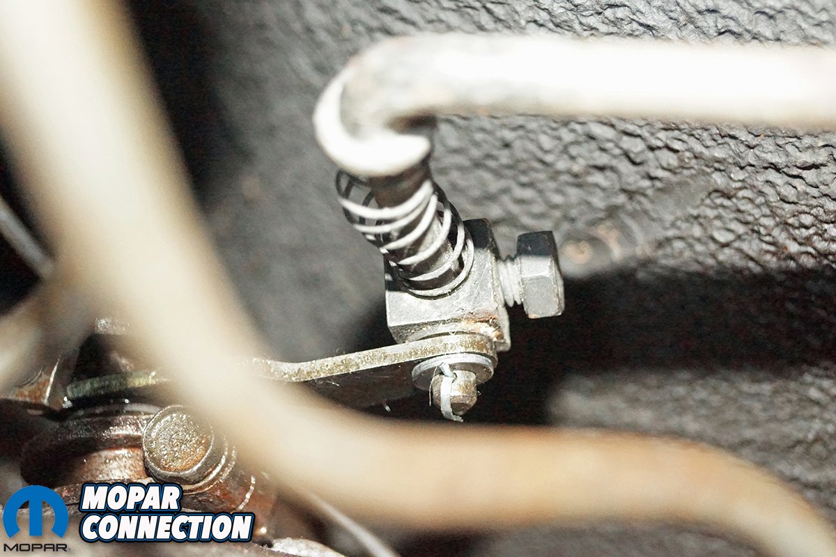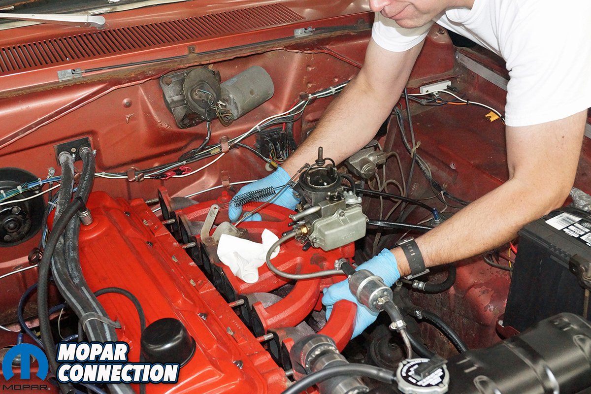 Top: The Dart was ran through the paces on a Mustang chassis dyno at Pennsylvania College of Technology in our previous distributor tuning article, which also gave us a baseline of 99 HP and 151 Ft-Lbs. Bottom Left: Starting with the removal of the one-barrel and manifold assembly, the kick-down throttle rod was disconnected from the transmission shift lever. Bottom Right: With the Slant 6, the fasteners can be accessed from the engine bay rather than from underneath the vehicle.
