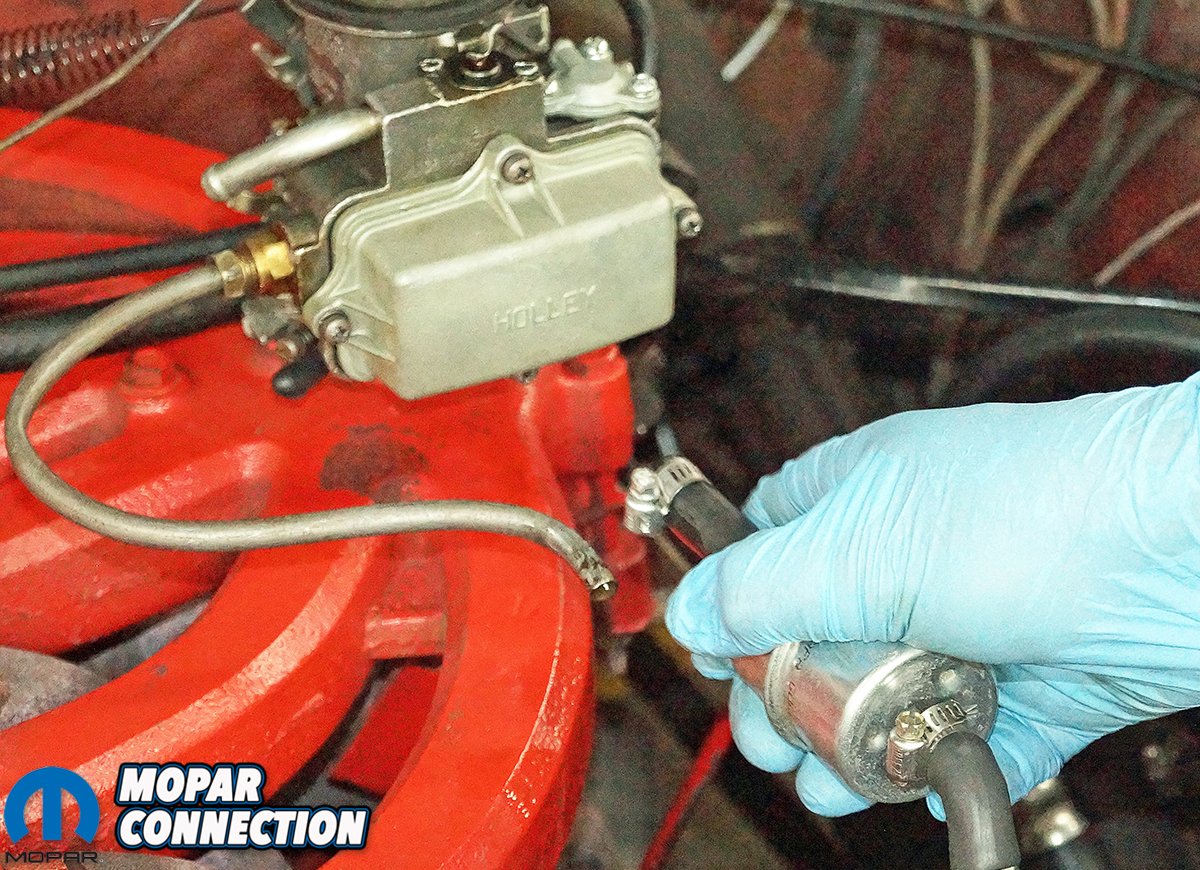With the entire Super Six assembly installed, we reinstalled the negative battery cable. The ignition key was twisted and the engine roared to life. We quickly noticed the carburetor was leaking at the inlet to the float bowl. A damaged gasket at the inlet to the float bowl was the culprit. We replaced the gasket, and immediately, we were back in business. The engine idled nicely. The choke operated as it should. With a few turns of the idle speed adjustment screw, we had the 225 idling at 650 rpm while in gear. The Dart was taken for a quick road trip, and upon return, the idle speed was readjusted slightly to maintain the 650 in gear rpm.