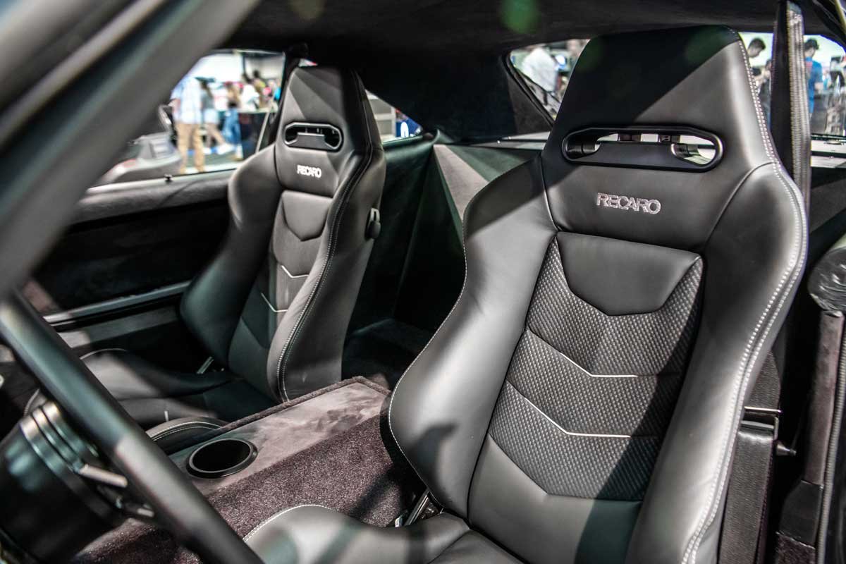 RECARO leather seats incorporating custom stitching and five-point seatbelts