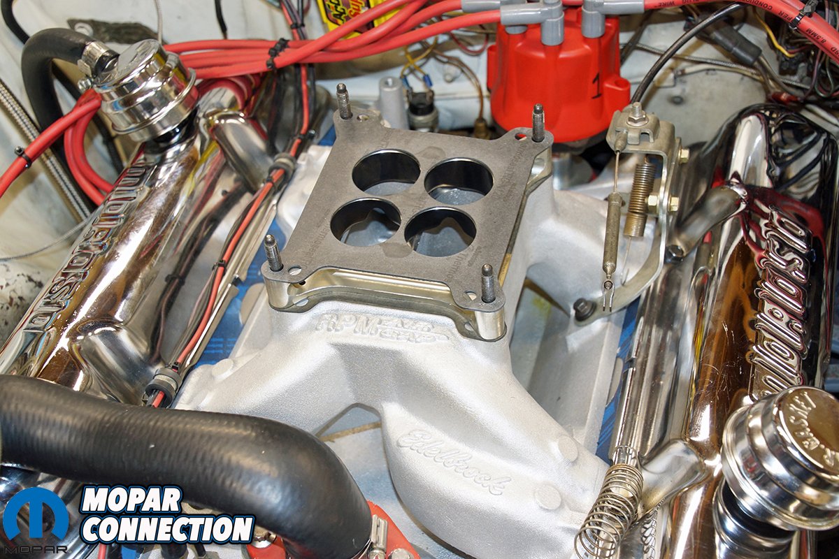 The gasket-matched (by us) RPM Air-Gap from Hughes Engines was placed onto the gaskets, and the manifold fasteners were torqued to spec. The thermostat housing was reinstalled, a new by-pass hose was slipped onto the manifold and the cooling system was refilled. The carburetor was placed onto the Air-Gap manifold along with the tapered four-hole spacer. We adjusted the carburetor for wide-open throttle and reconnected the shifter linkage. The oil was drained, and seven quarts of 5w-30 was poured into the crankcase. With the engine buttoned up, the engine was started and warmed up. No leaks (fuel, coolant, or oil) were noted, so we completed the routine maintenance and readied the Dart for the next test session.