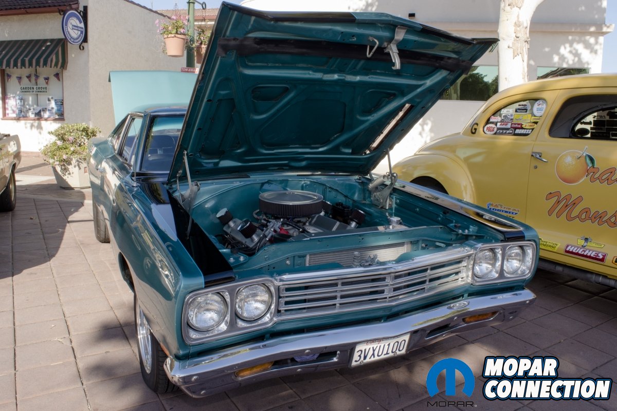 Sitting next to the 1968 Valiant, was a beautiful 1969 Plymouth Road Runner, brought in by Lee Tracey from the Mopar Knights Car Club. This Road Runner had a number of different features, including a 493, Ferrera springs, a Holley 950 carburetor, and a Hurst shifter. The car was repainted in the original Seafoam Turquoise. Tracey also kept the Voice of Road Runner horn with its signature sound from the famed cartoon character that this car was named for.