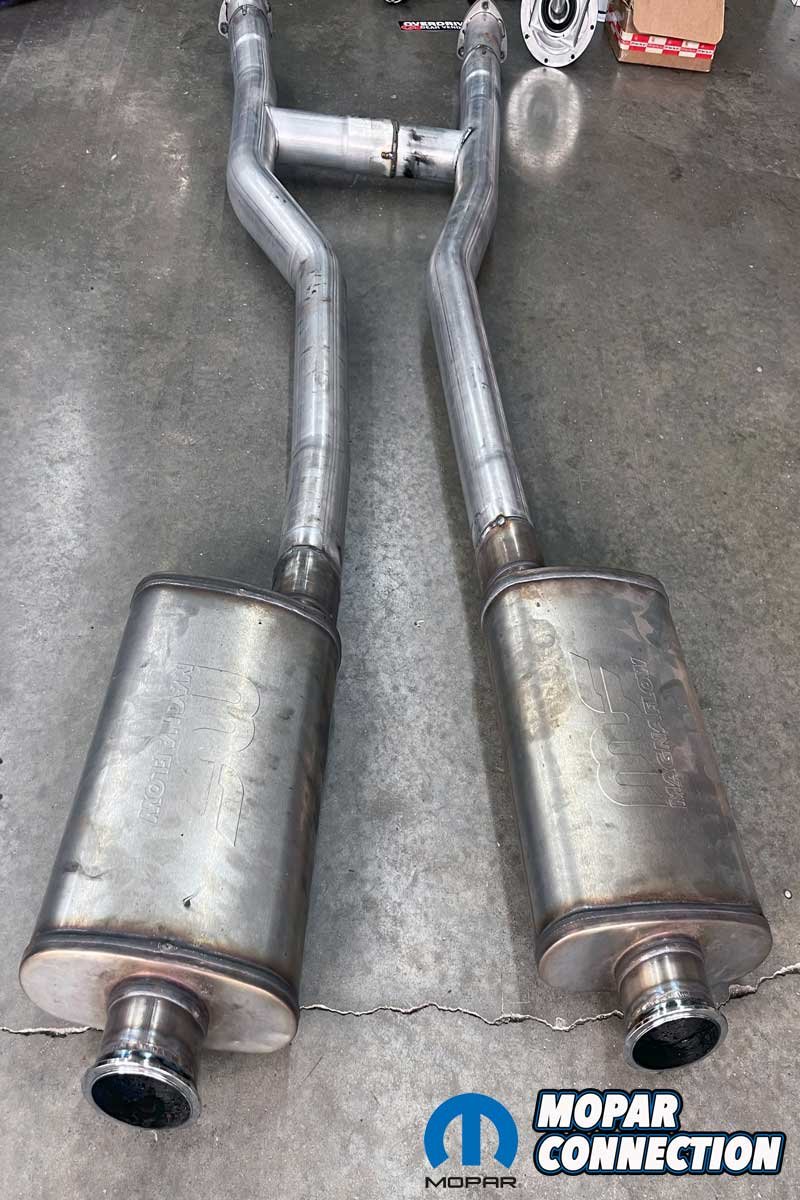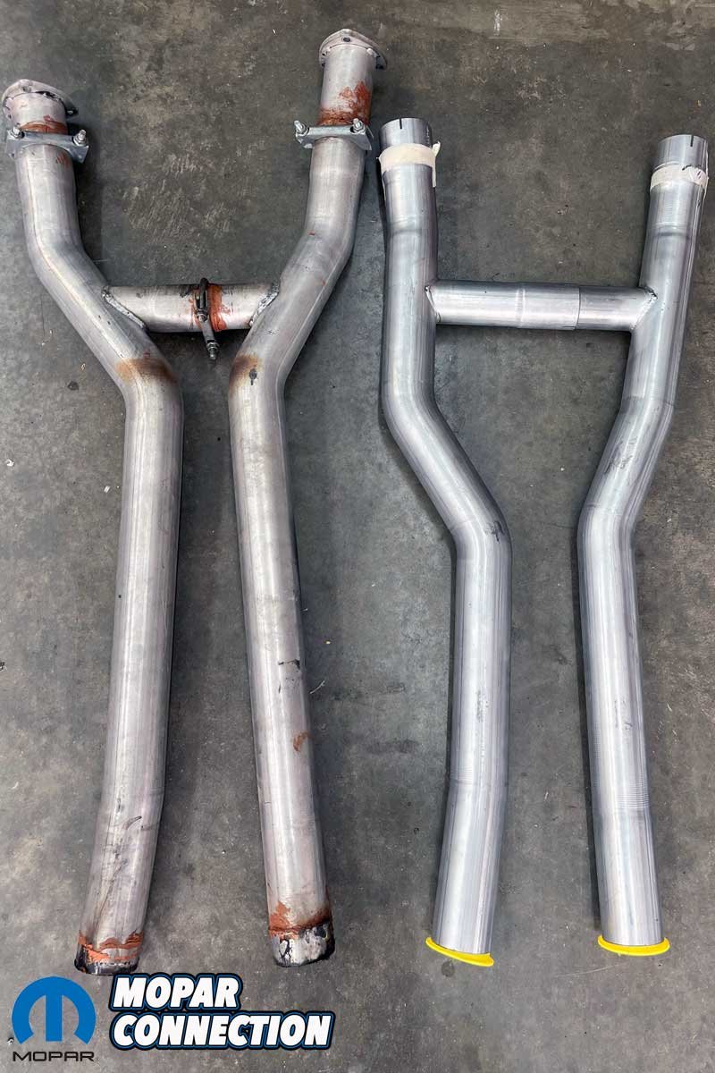Above Left: The TTI exhaust on the ‘Cuda (left) would not fit with the Gear Vendors unit. TTI does make a mid-pipe that clears the unit and still attaches to the header pipes and the mufflers without additional modifications. Above Right: We decided to weld the header pipe adapters to the mid-pipe and use band clamps on the mufflers.