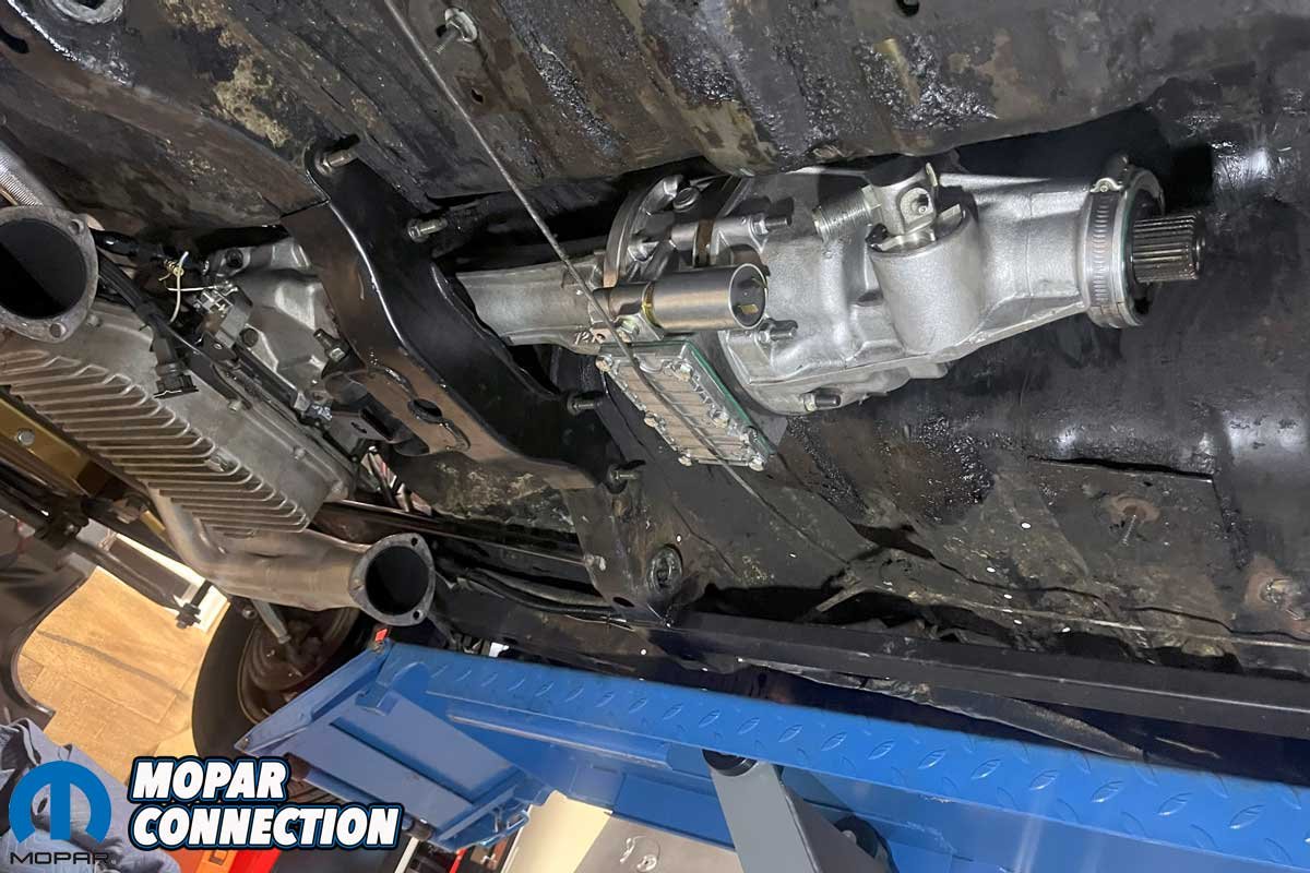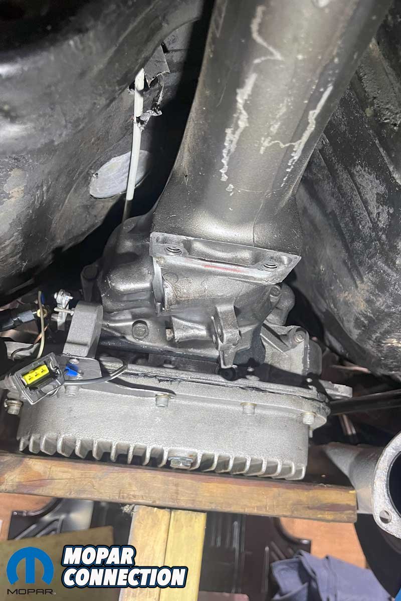 Above: The transmission support member (crossmember) had to be removed to access the transmission. The tail shaft housing would be removed and set aside as it would not be reused with the Gear Vendors installation.