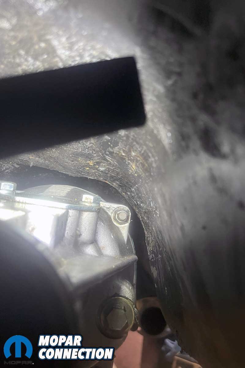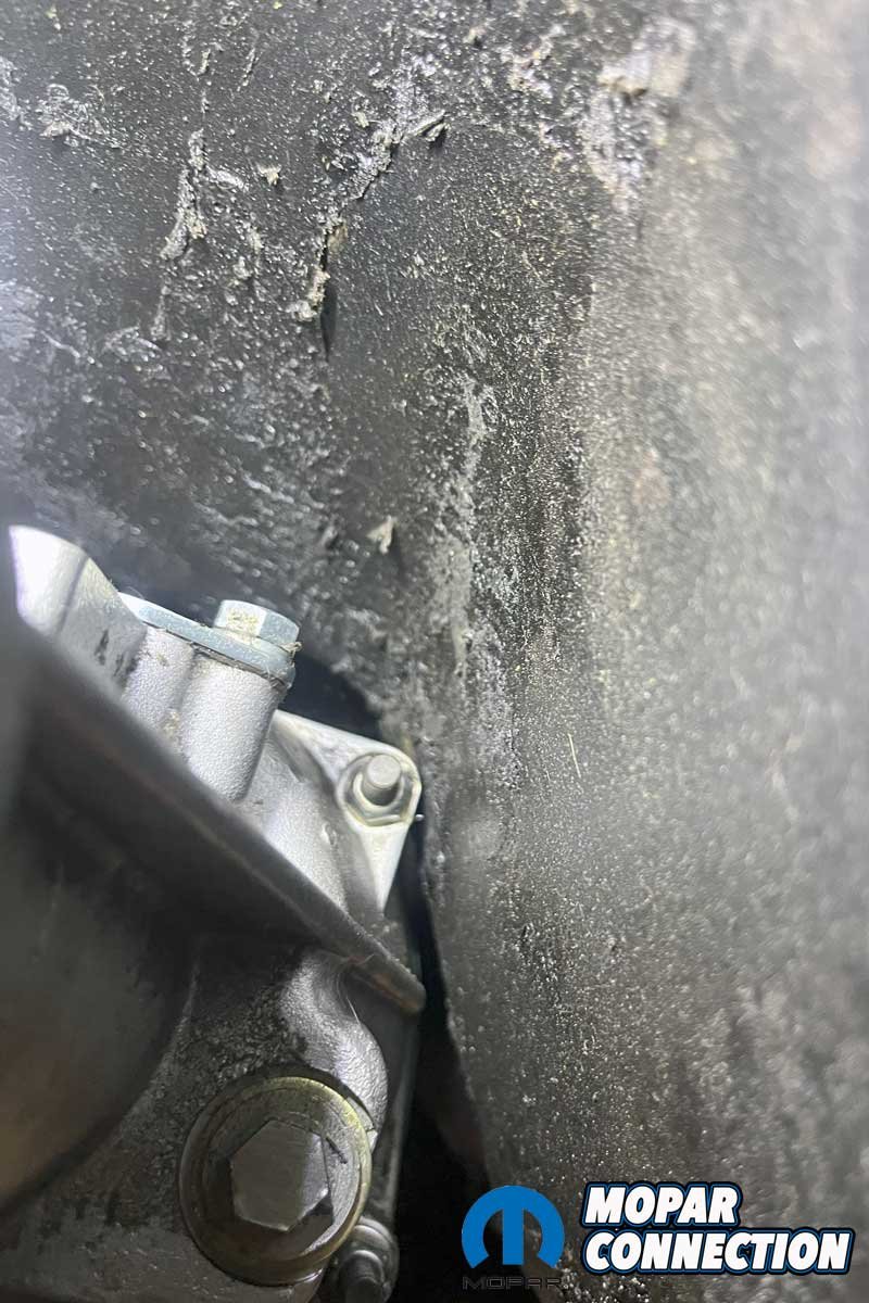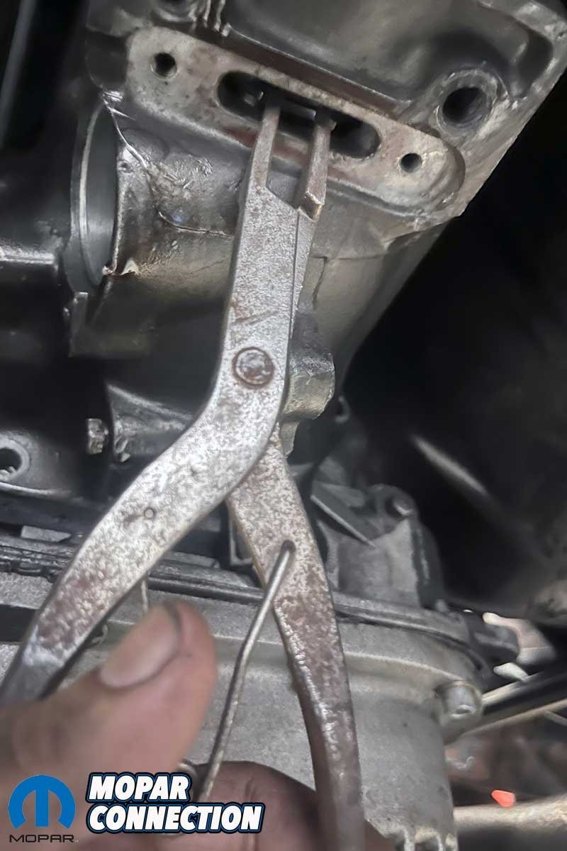With the transmission in park, we removed the small cover on the bottom of the tail shaft housing secured by two Phillips screws. Here, you will need patience and a good pair of closing-style snap ring pliers to unseat the snap ring, which locks the tail shaft bearing to the housing. With the snap ring released, we removed the housing after a few strategically applied mallet blows.