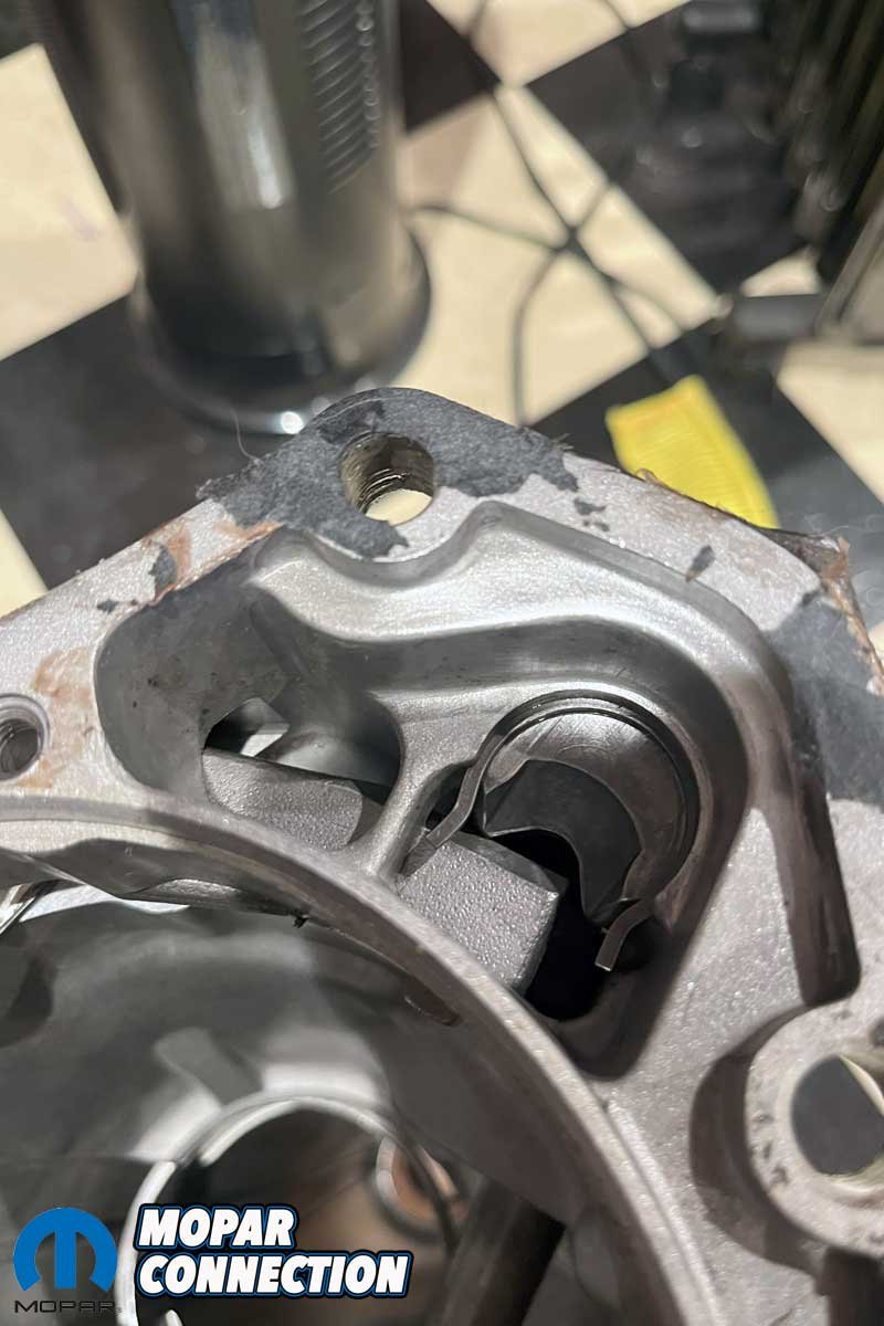 Following the instructions, we swapped parts from the factory tail housing into the Gear Vendors tail housing. We removed the lock pawl assembly and the snap ring for the bearing from the original tail housing and noted how they came apart so we could easily transfer them to the Gear Vendors tail housing.