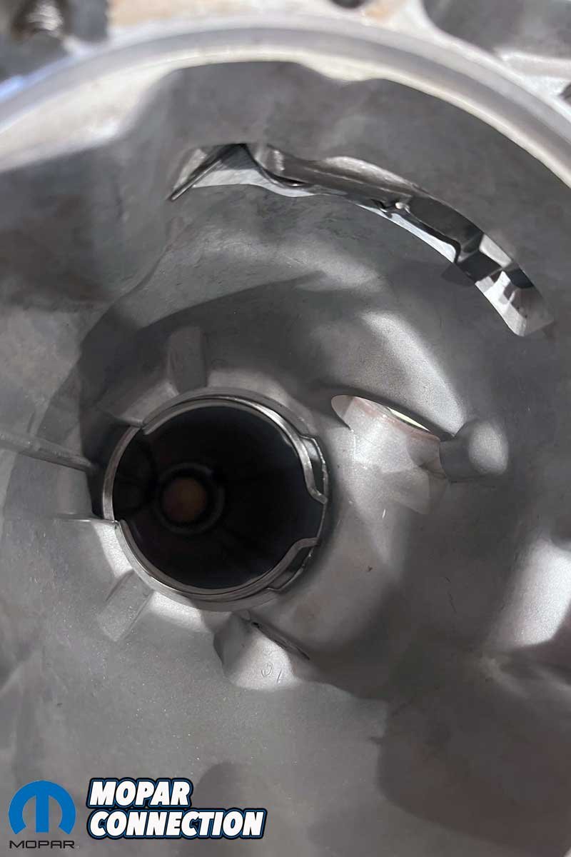 Above Left: The snap ring from the factory Torqueflite was not removed. Above Right: Instead, the Gear Vendors tail shaft extension includes a new snap ring to secure it to the transmission output shaft.