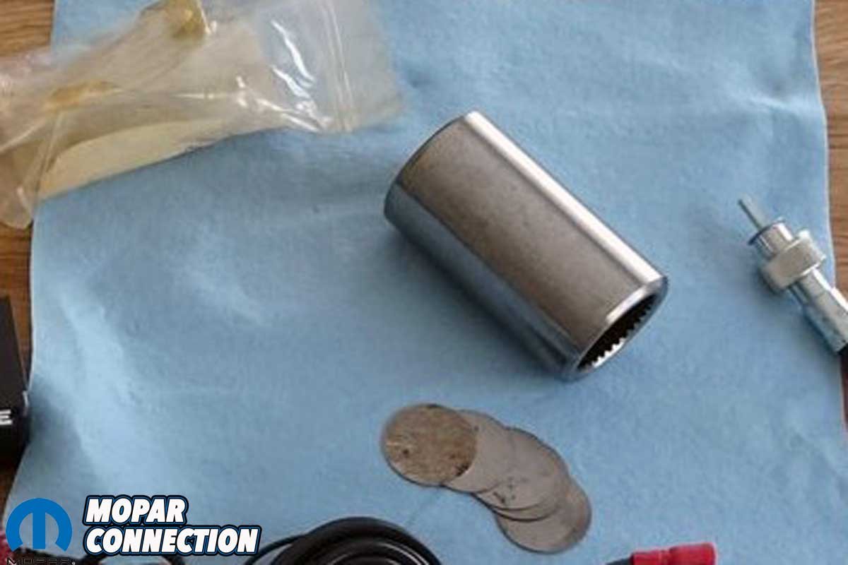 Above Left: The Gear Vendors kit included a coupler that slips over the output shaft splines and the overdrive unit’s input shaft. The shims were used to attain the proper end play. Above Right: A “straight edge” was placed on the gasket surface of the Gear Vendors extension housing, and we added shims to achieve the desired measurement.