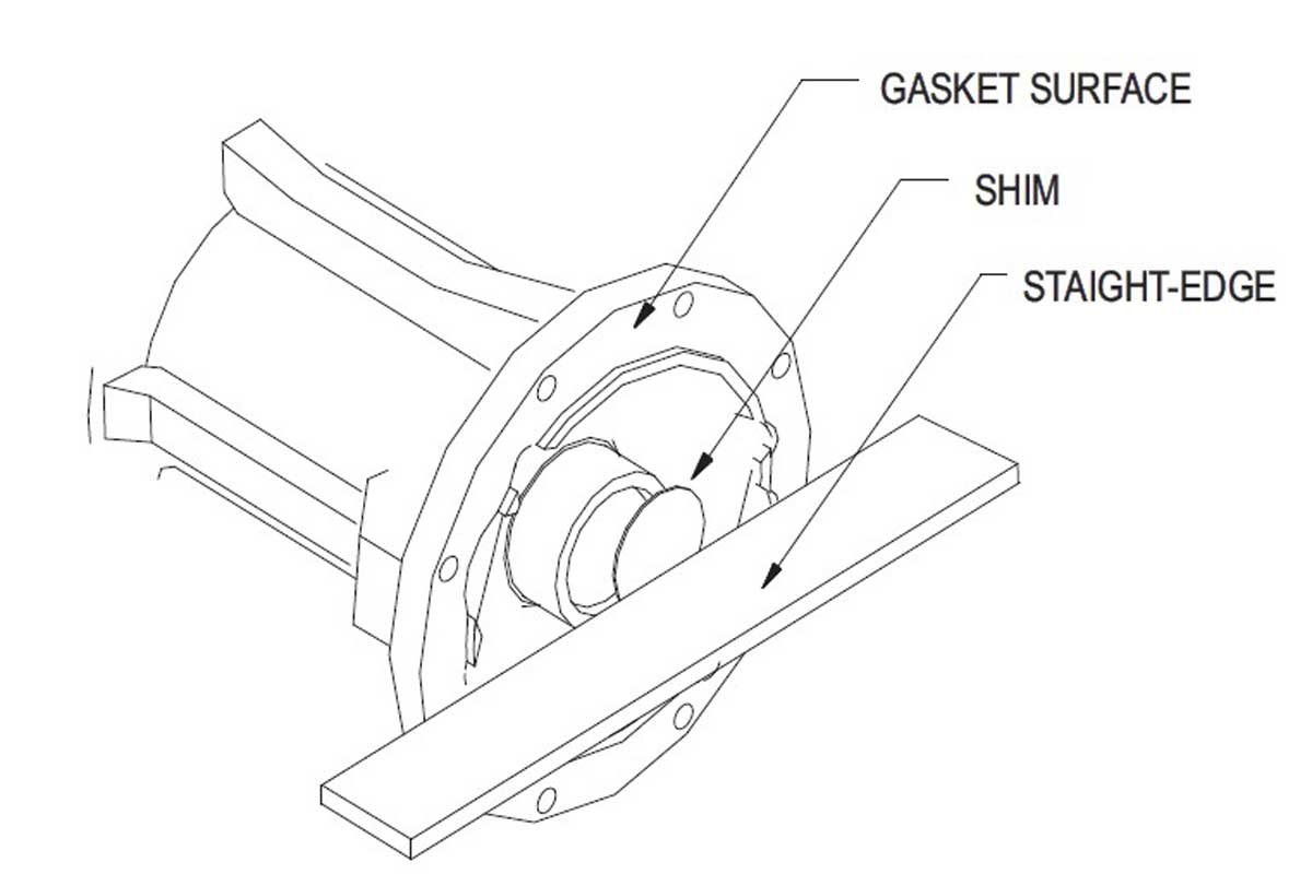 The measurement procedure was as follows: We installed the gasket on the surface of the tail housing, greased the splines, and slid the coupler over the splines until it stopped. Next, we laid a straightedge across the gasket surface and used feeler gauges to measure the gap between the straightedge and the coupler’s face. The end play should be less than 0.020″. If it is greater, remove the coupler and add shims (provided with the kit).