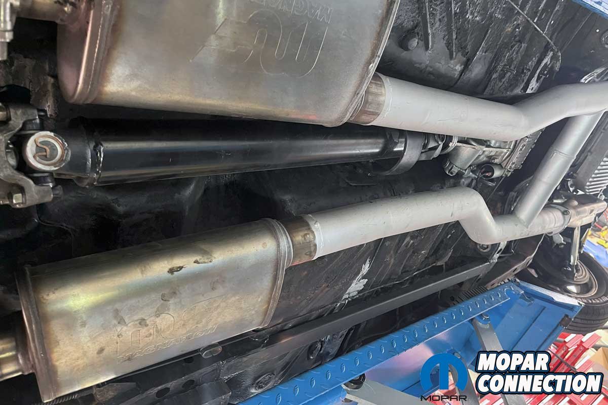 Above Left: After a light massage of the floor, the overdrive unit fit like it was installed at the factory. After the photo, we had to reroute the park brake cable because it rubbed on the overdrive unit. Above Right: We installed the custom-built driveshaft (sourced locally) and fitted the new TTI mid-pipe and muffler section of the exhaust.