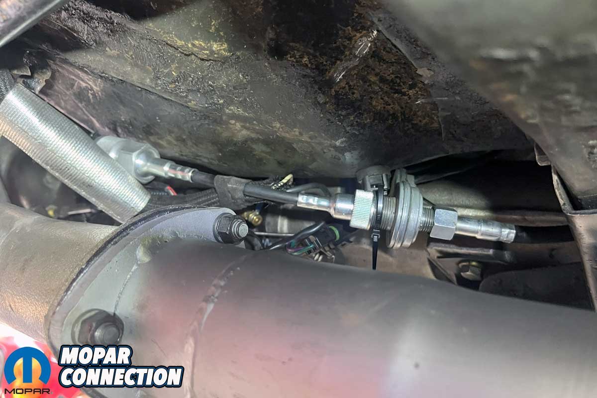 While we waited for the driveshaft’s construction (delivered the next day), we installed the speedometer cable. Gear Vendors supplied an extension cable with a speed sensor as part of their package. We routed the extension cable as the factory had and threaded it into the overdrive unit. After installing the extension cable, we attached the speedometer cable to the Gear Vendors speedometer sensor.