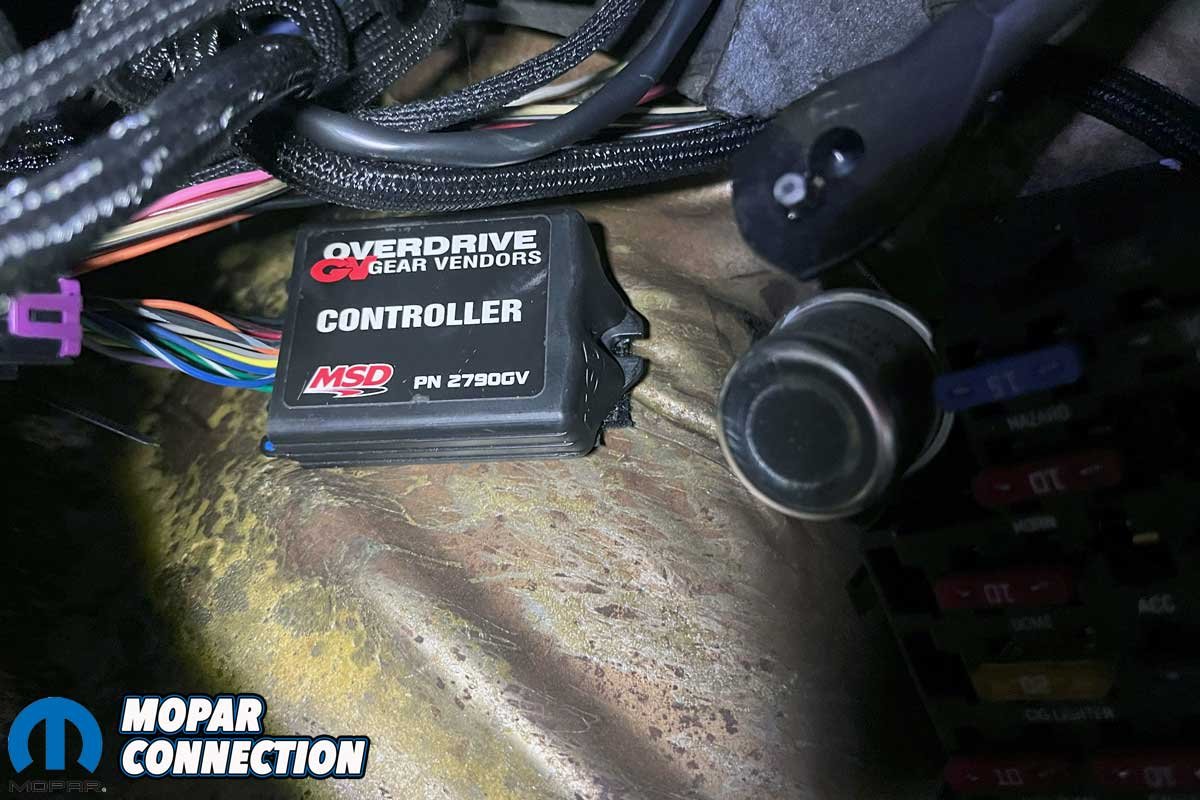 Above Left: Due to electromagnetic interference (EMI), we added a 6″ speedometer cable to spread out the Gear Vendors speedometer sensor and our current Dakota Digital speed sensor. Above Right: We installed the Gear Vendors overdrive controller under the dash.