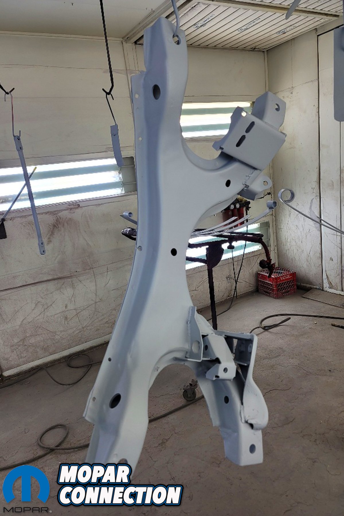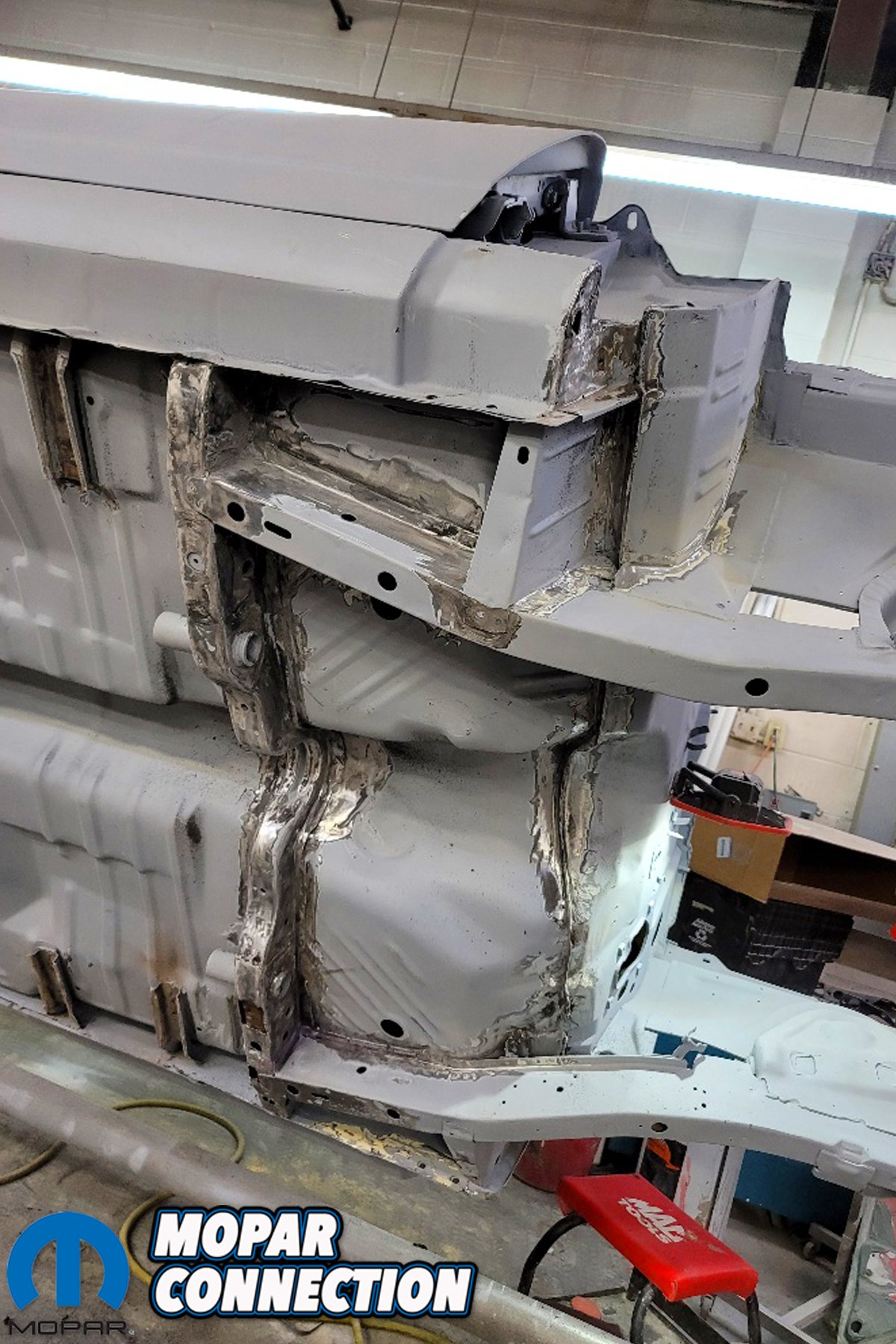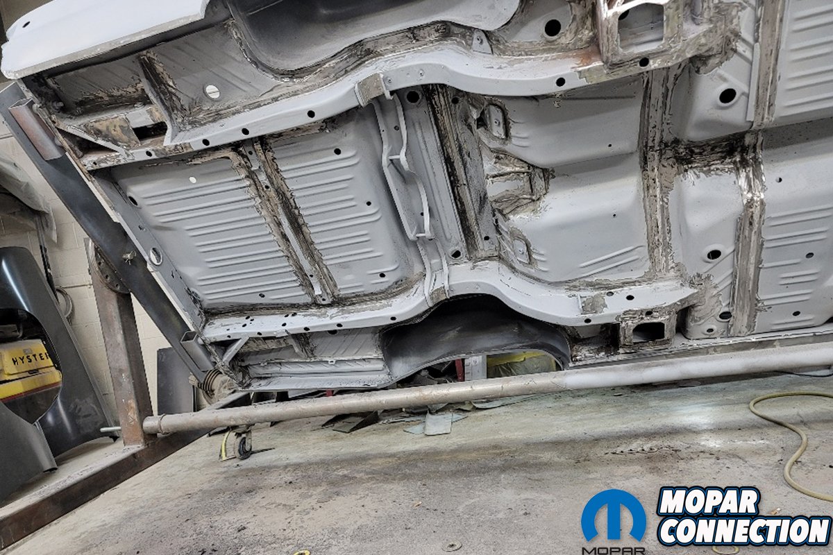 Above left: We were not kidding when we said that every seam and weld was ground down to metal, inspected and re-welded when necessary. This will be one solid car when finished. Almost all metal will be replaced, “correctly” and the bones of Black ‘Bird will be solid. Above right: Since the suspension parts were documented original to the Black ‘Bird, they were all saved and restored. This original Hemi K-member was in exceptional shape with no visible damage or rust problems. Other suspension parts were blasted and were primed at the same time in the spray booth.