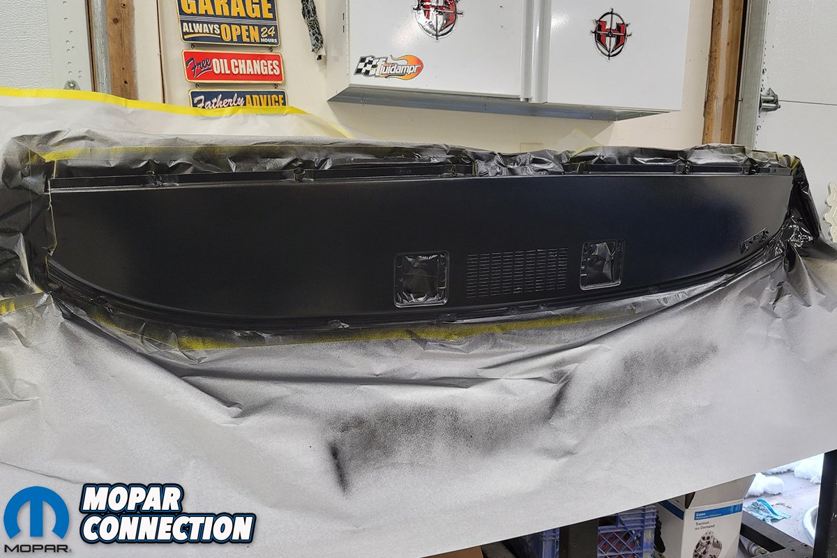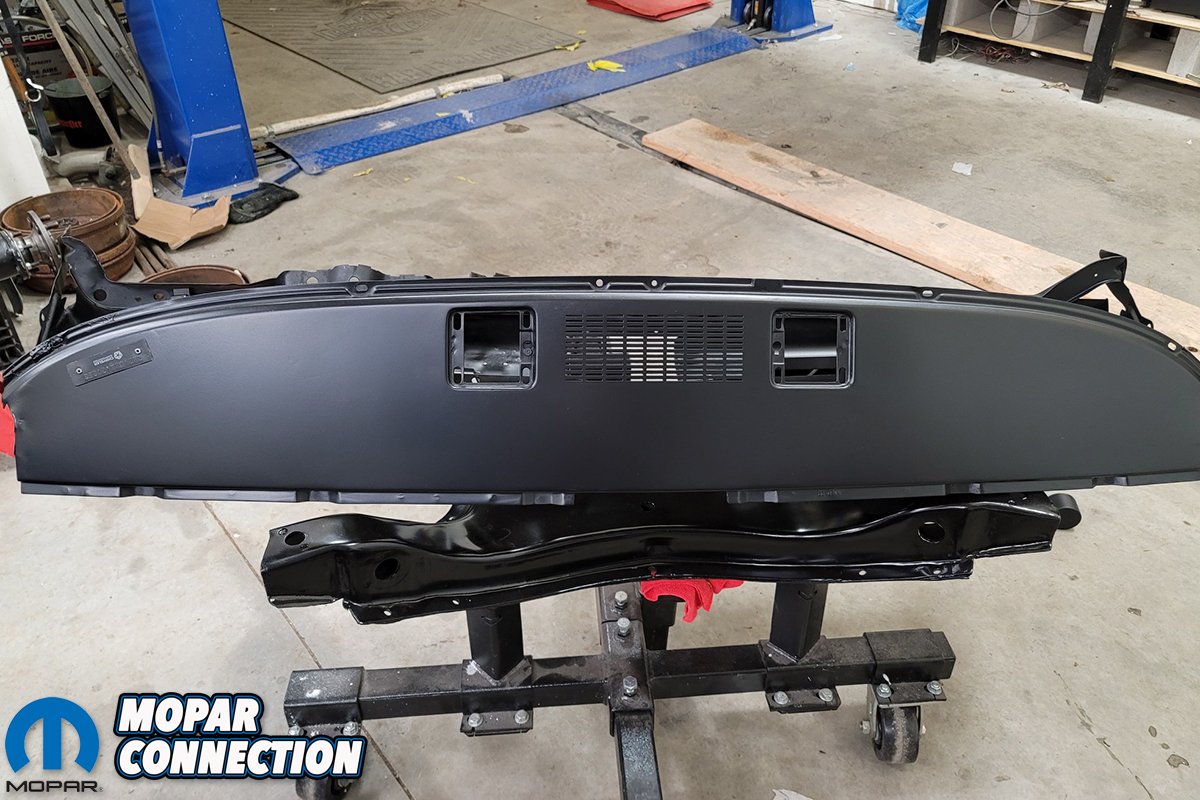 Above left: Since this was the original dash to the Hemi Black-Bird, the VIN tag was not removed. It was carefully protected during the blasting and repaint of the dash. Here you can see the freshly sprayed paint looks too shiny and does not replicate the original finish. That is because the paint is freshly sprayed. Above right: Brian followed our step-by-step process for duplicating the correct “suede” finish detailed in the Comeback ‘Cuda dash restoration article. The results are spot on original in appearance and the VIN tag has the original un-touched finish and “Chrysler” decal still intact. We intentionally took this reference picture of the dash and K-member together to show the contrast between the finishes.