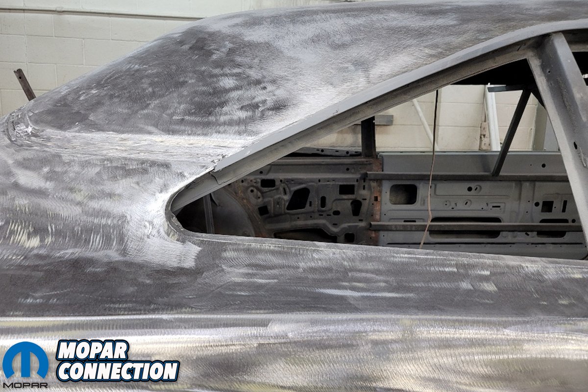 Above left:After all the discoveries on the underside of the “finished shell”, it was decided that Black ‘Bird needed to be taken back down to the bare metal. After all it is a real Hemi Road Runner, and it deserves the beat restoration possible. Plus, the new owner has already invested a good amount of money in the purchase and in transportation costs and time. We are so glad that Brian is totally committed to bring this rare Black ‘Bird back to its original glory, “Correctly!” Above right: The roof skin has been replaced on the car as well as the roof rail drip channel. As you can see that seam still needs additional attention. The welds and the seams will be repaired correctly, and the final finish will show the improvement and the correct detailed steps taken at this point of the game.