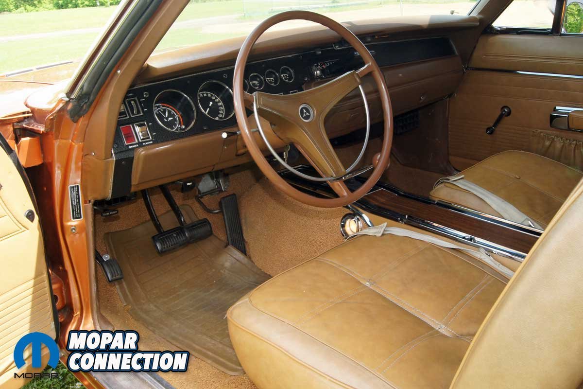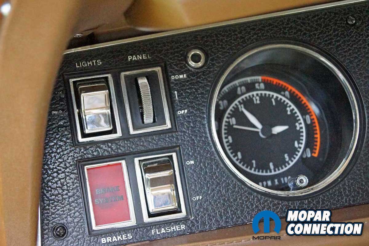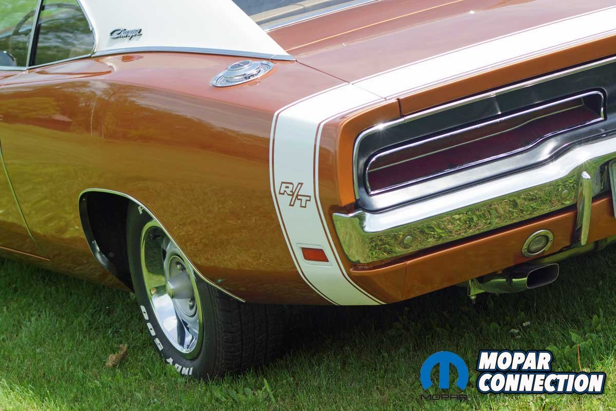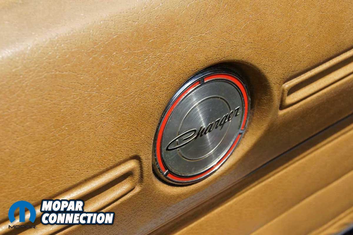 During this time, Avezzie took the time to reweld several factory welds of the passenger inner fender well, which had separated after several high-speed, spirited runs on the test track at the Chrysler Proving Grounds in Chelsea, Michigan. After the detailed cleaning, the Charger received a fresh coat of T5 Bronze Fire Poly and a NOS bumblebee strip to complete the update. After more than fifty years of service, the saddle tan seat covers and the factory door panels remain in place.