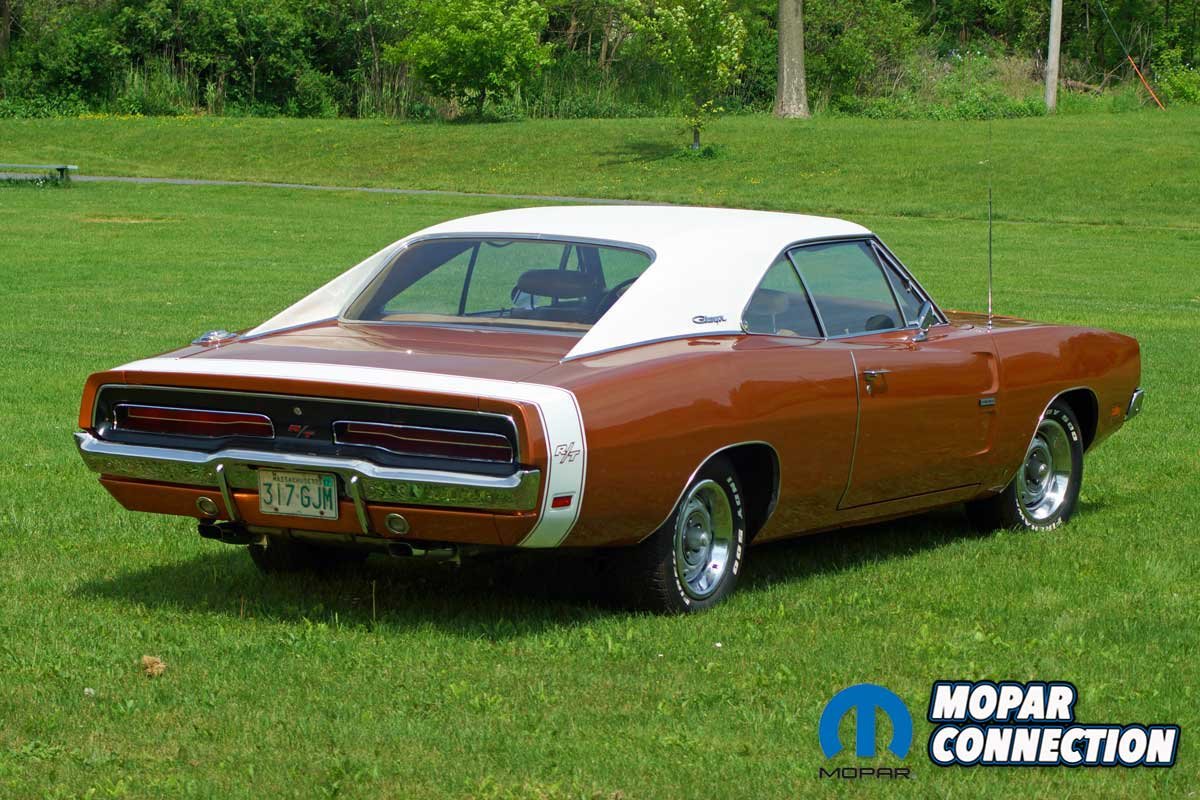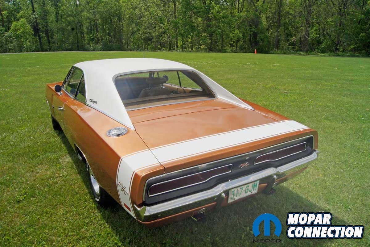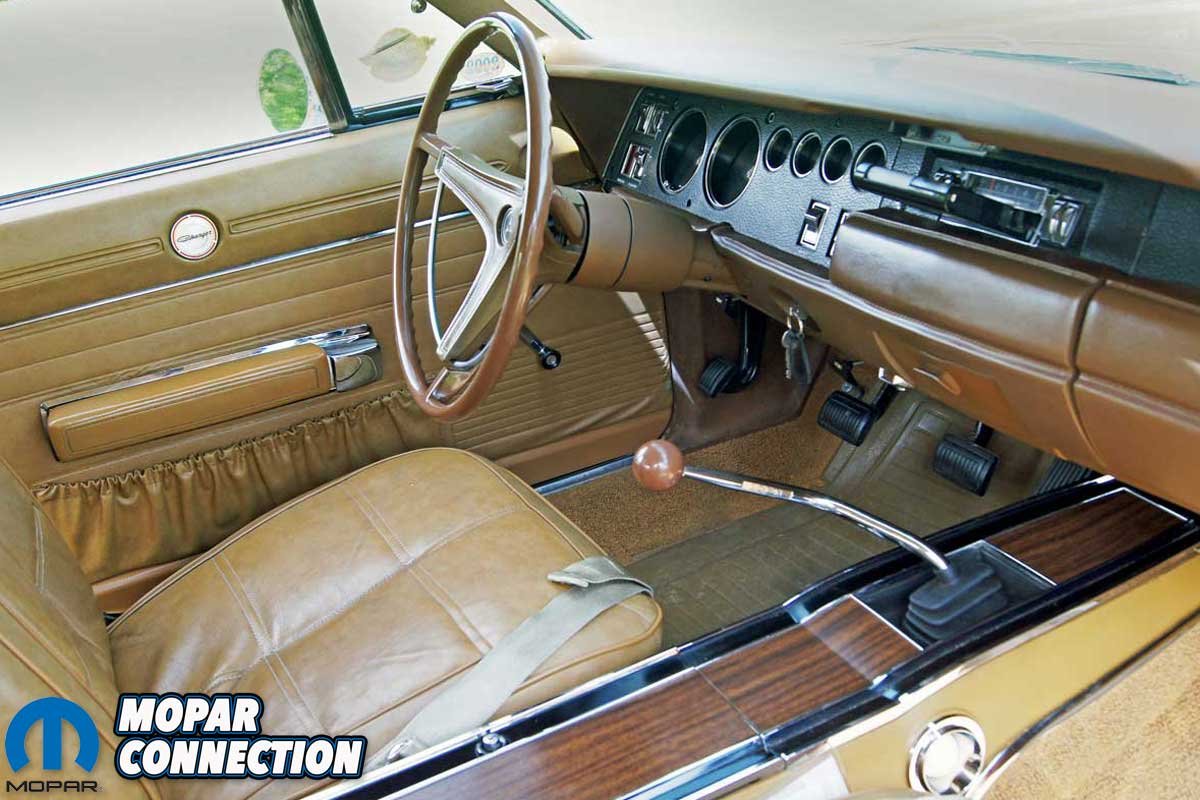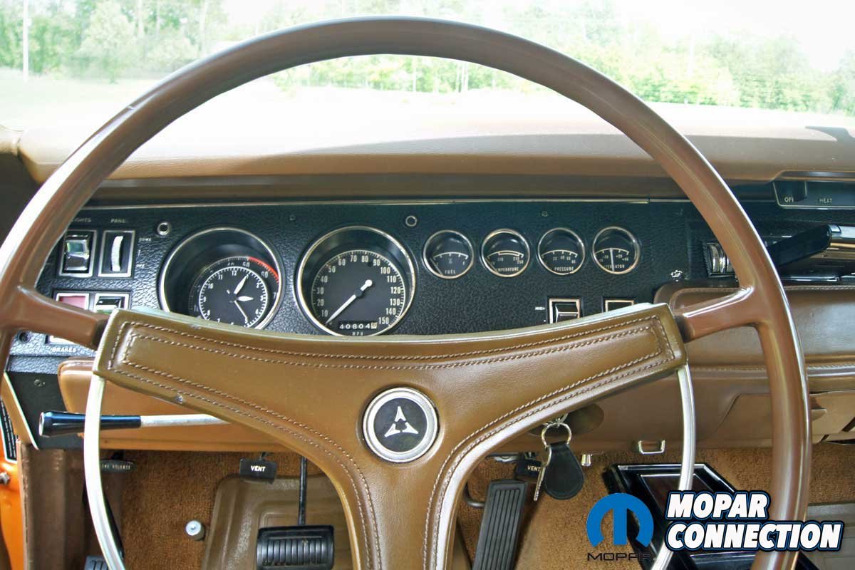 During this time, Avezzie took the time to reweld several factory welds of the passenger inner fender well, which had separated after several high-speed, spirited runs on the test track at the Chrysler Proving Grounds in Chelsea, Michigan. After the detailed cleaning, the Charger received a fresh coat of T5 Bronze Fire Poly and a NOS bumblebee strip to complete the update. After more than fifty years of service, the saddle tan seat covers and the factory door panels remain in place.