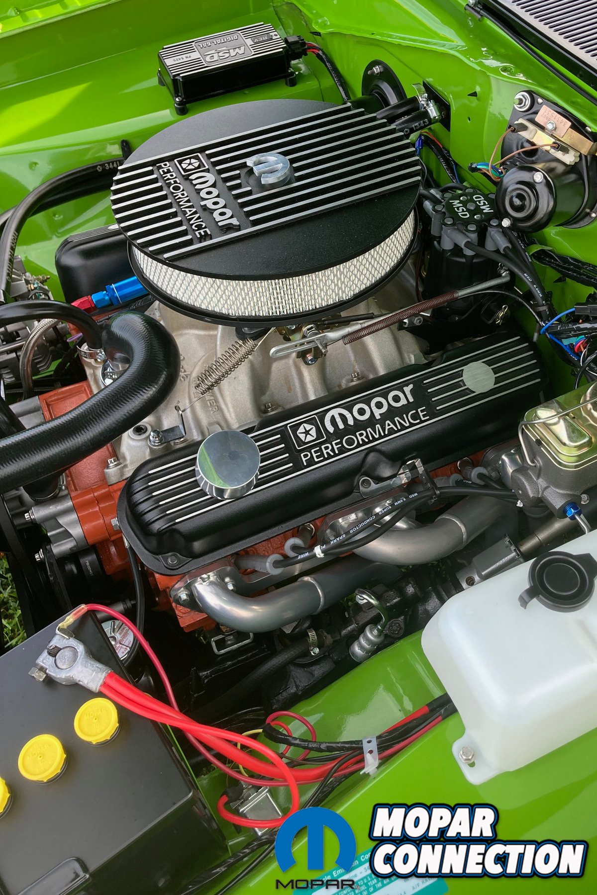In fact, the ability to balance straight line performance with the same degree of competence necessary to conquer corners is all in a day’s work for the Hemi Classic GSS Challenger. Insuring that it always stays firmly planted, a set of Hurst lowering springs provide an enhanced center of gravity, in conjunction with more aggressive spring rates. Providing a ferocious grip on the street and strip that maximizes the benefits of the lowering springs is rolling stock that consists of 20” x 10” Hurst Stunner show chrome wheels at all four corners that are matched with a set of sticky Nitto NT 555 G2 tires. The fronts are Hellcat spec 275/40ZR20, while at the rear, a pair of jumbo 315/35ZR20 provide a near steamroller appearance when viewed from behind. This is one wheel and tire combination that takes the slogan “where the rubber meets the road” to a whole new level, further amplifying the handling prowess of the already capable Hemi Classic GSS.