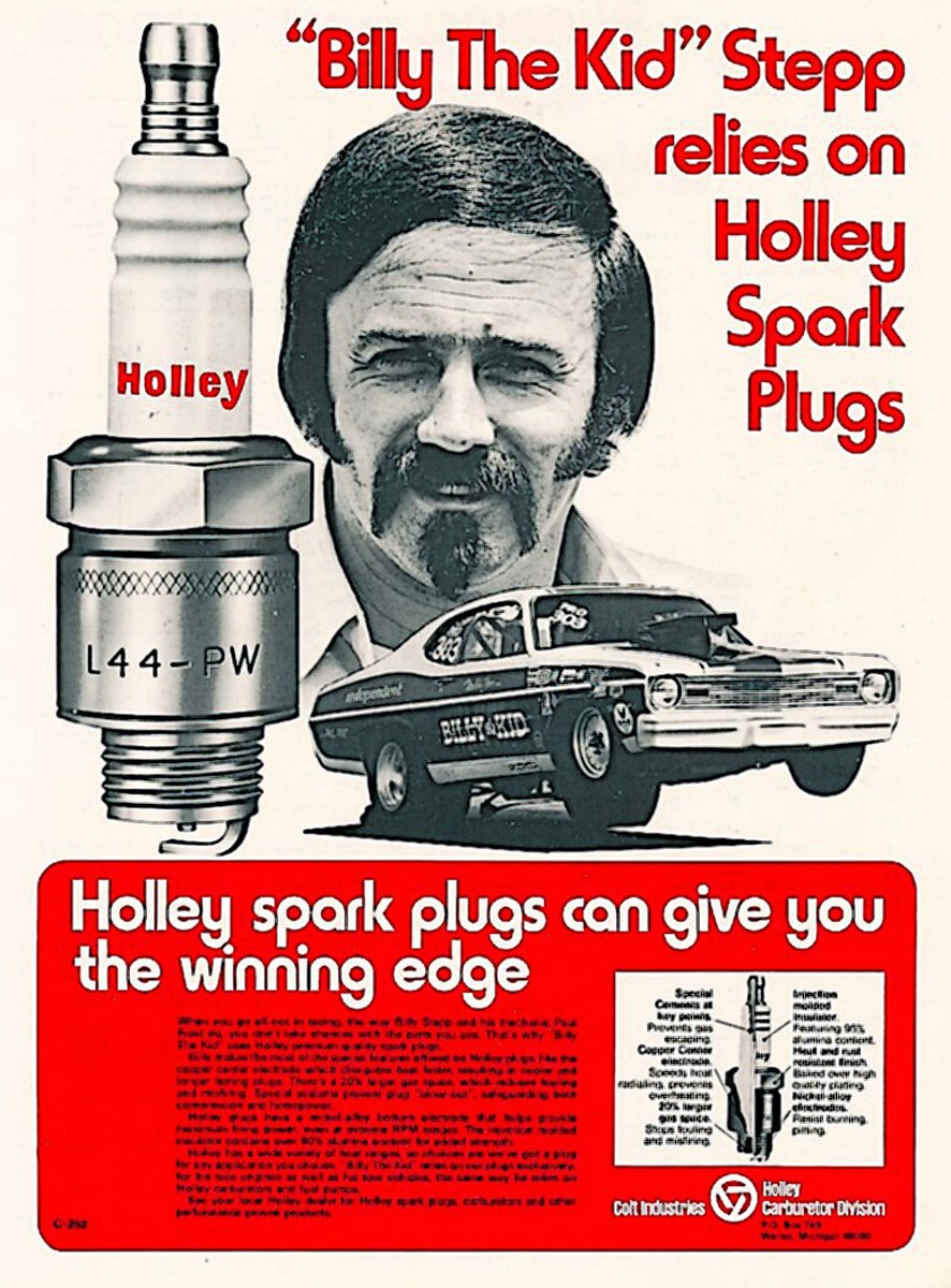 Above left: In the 1970s, Holley, owned by Colt Industries, sold spark plugs under the Holley name as depicted in this June 1974 Popular Hot Rodding magazine advertisement. Hitachi, Ltd manufactured the plugs. The plugs contained a high-nickel electrode, a copper core, and an increased gas space area, which were advanced technology for the era. Billy Stepp’s Mopars took advantage of the Holley spark plug knowledge. Above right: With sixteen Holley spark plugs installed in the Hemi cylinder heads, Stepp’s Duster’s quarter mile elapsed times dropped into the 8.90s at over 150 mph. The spark plugs provided Stepp’s drivers the winning edge at multiple International Hot Rod Association (IHRA) races.