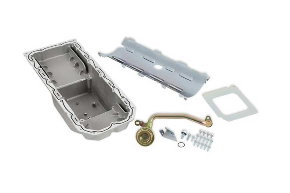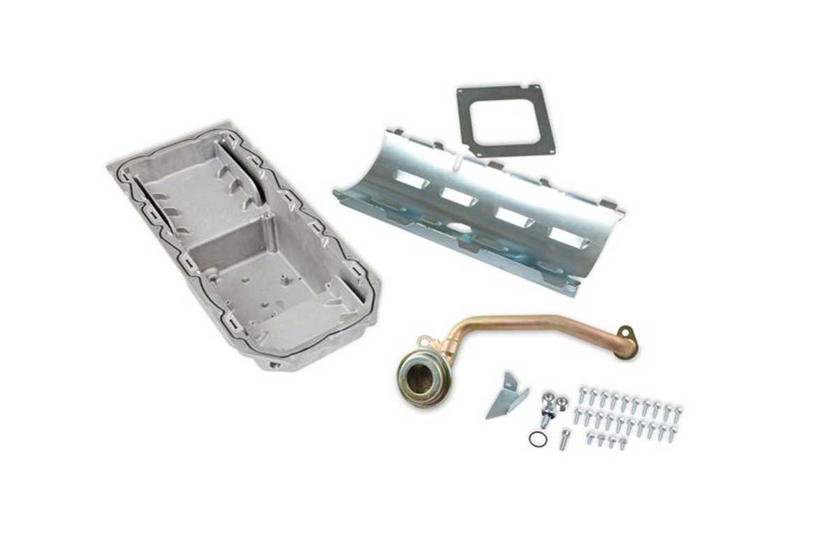 Above: Holley offers multiple oil pan designs to clear the k-member and fit a 5.7-, 6.1-, 6.2-, and a 6.4-liter Hemi. The pans come with a windage tray, oil pickup, O-ring, deflector, and mounting hardware.