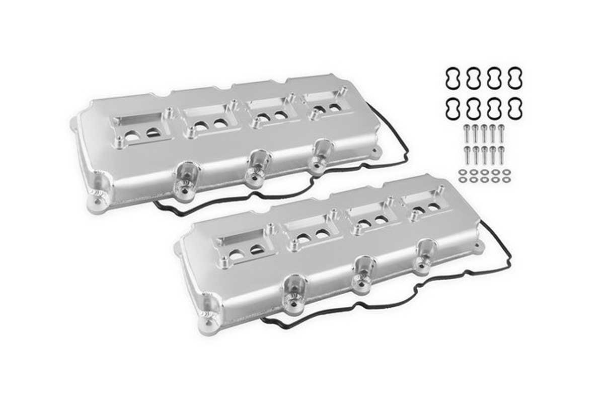 Above Left: Sniper EFI and Mr. Gasket offer some flash for the Hemi. The valve covers come in a polished or black finish. Above Right: To get air into the Hemi, Flowmaster has an “assemble as needed” Delta Performance Air Intake system that can be fitted to the confines of the engine bay.