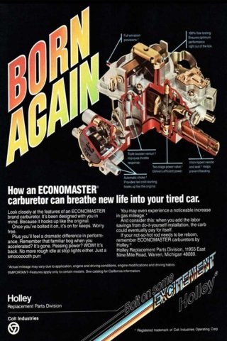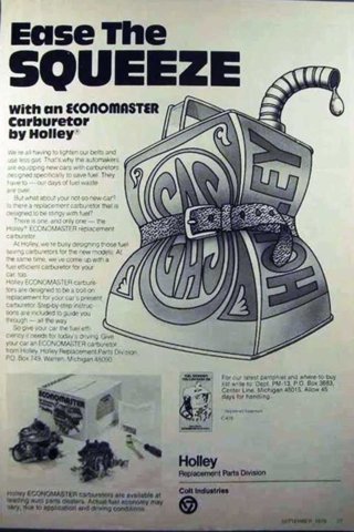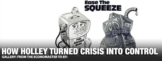 Above Left: In response to the early 1970s oil crisis, Holley Performance Products rapidly introduced the Economaster carburetor line. Available in one-, two-, and four-barrel versions, each was engineered to sip fuel rather than gulp it. Above Right: The Economaster delivered improved fuel economy as gas prices surged during 1973, rising from a national average of $0.39 to $0.84.