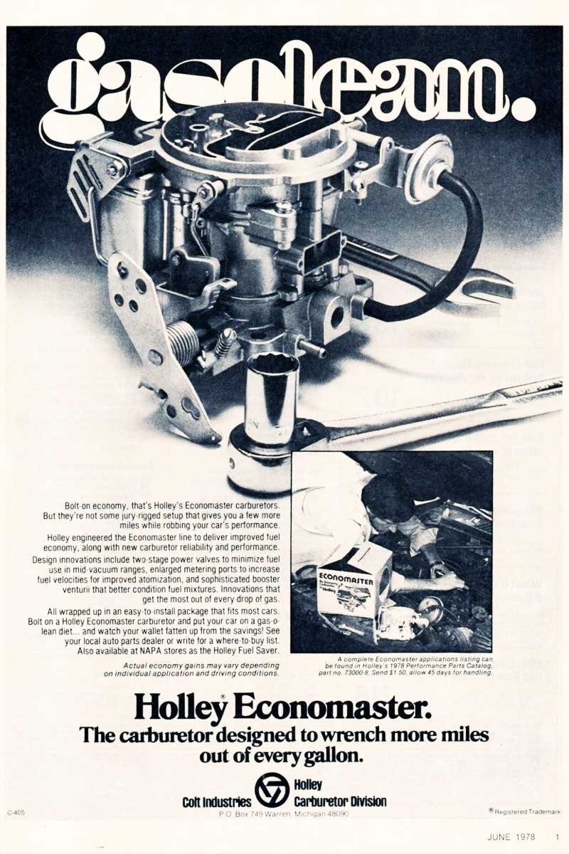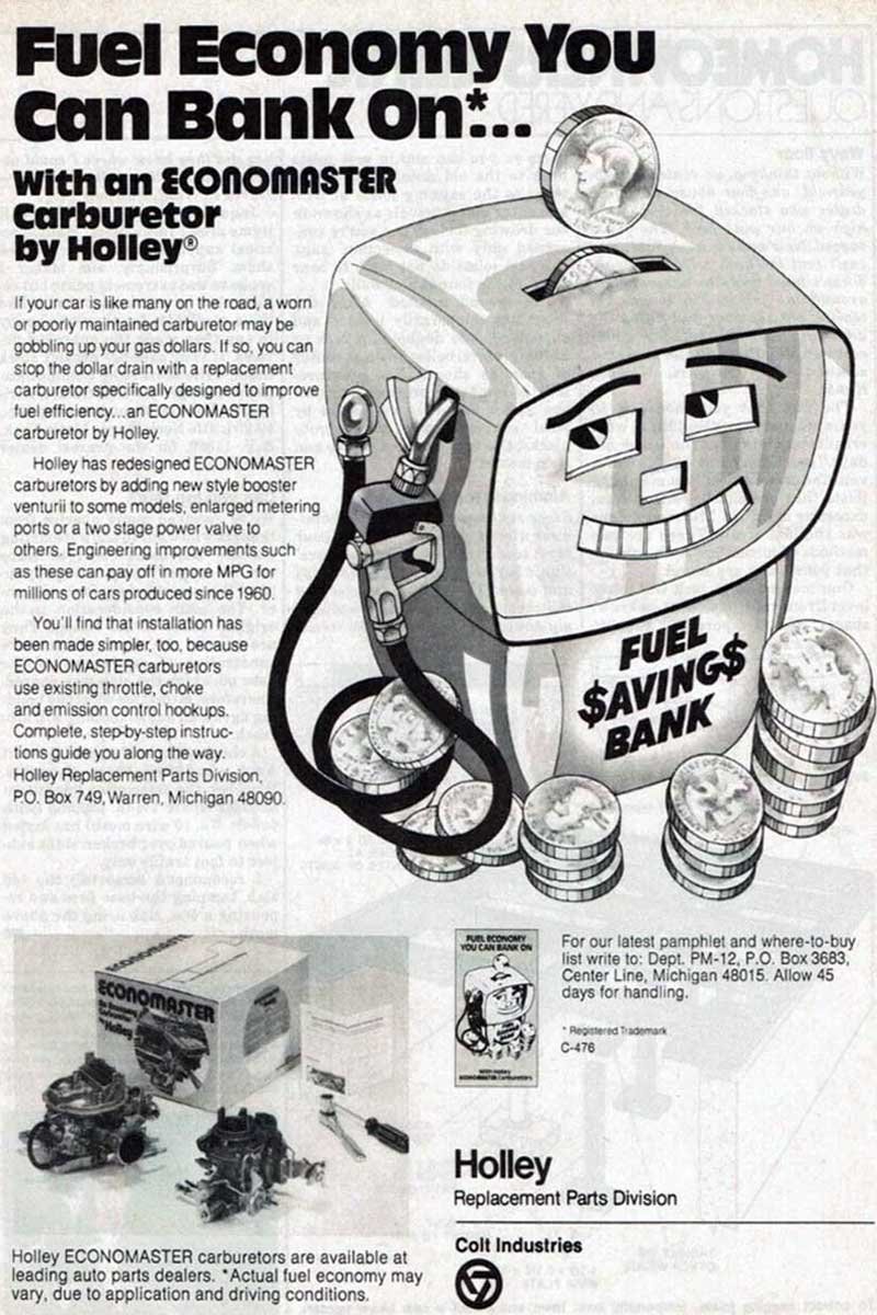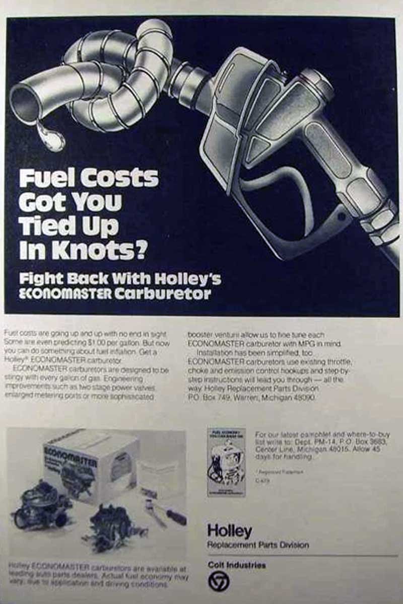 Above Left: In response to the early 1970s oil crisis, Holley Performance Products rapidly introduced the Economaster carburetor line. Available in one-, two-, and four-barrel versions, each was engineered to sip fuel rather than gulp it. Above Right: The Economaster delivered improved fuel economy as gas prices surged during 1973, rising from a national average of $0.39 to $0.84.
