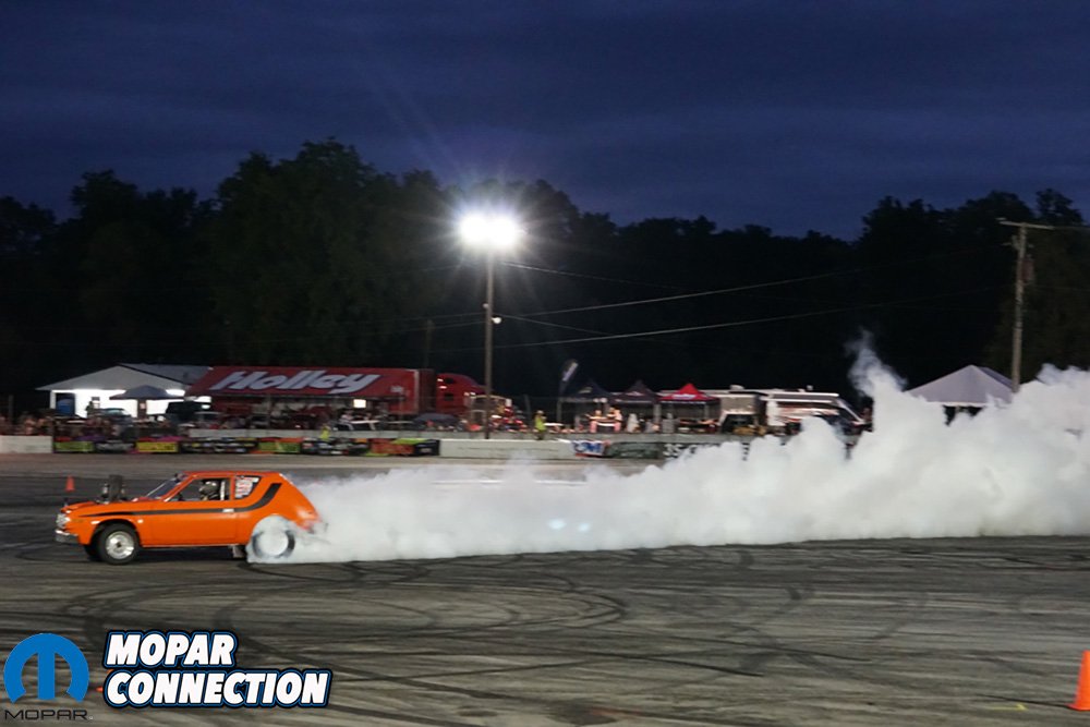 The Gremlin did have a small hiccup and had to rig up a throttle cable real quick. With the throttle cable fixed, it filled the park with smoke. They ended up popping both rear tires within the burnout time allotment.