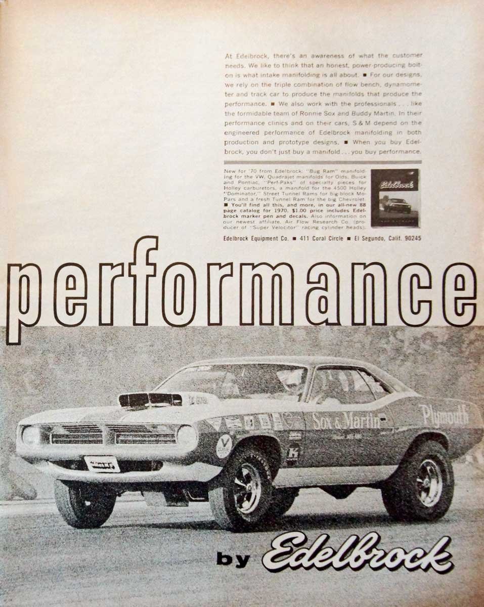 Edelbrock was part of Sox & Martin’s success. A May 1970 Hot Rod Magazine advertisement stated, “We also work with professionals…like the formidable team of Ronnie Sox and Buddy Martin. In their performance clinics and on their cars, S&M depend on the engineered performance of Edelbrock manifolding in both production and prototype designs.”