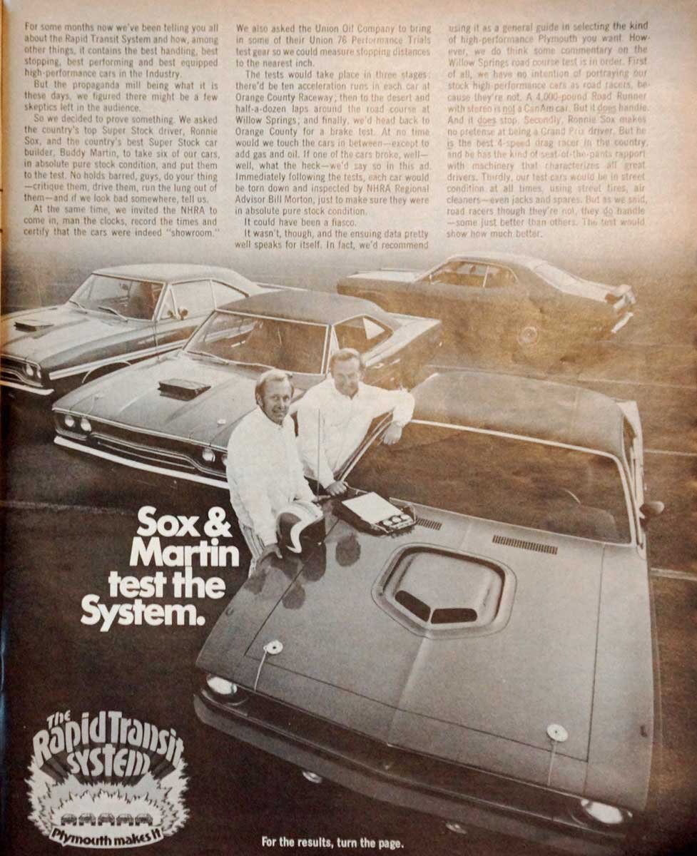 Above Left: Edelbrock is all about Performance. Sox & Martin teamed up with Edelbrock, as depicted in this May 1970 Hot Rod Magazine advertisement. Above Right: In the same Hot Rod Magazine, Sox & Martin tested the six vehicles of the Plymouth Rapid Transit System.
