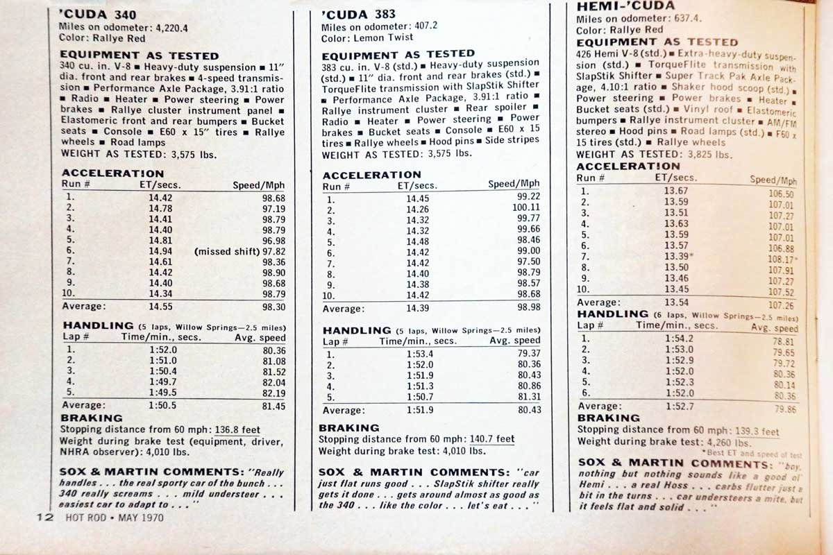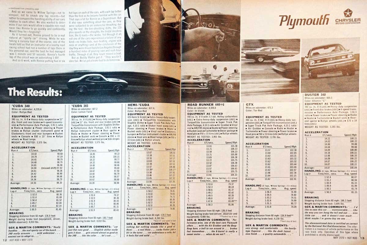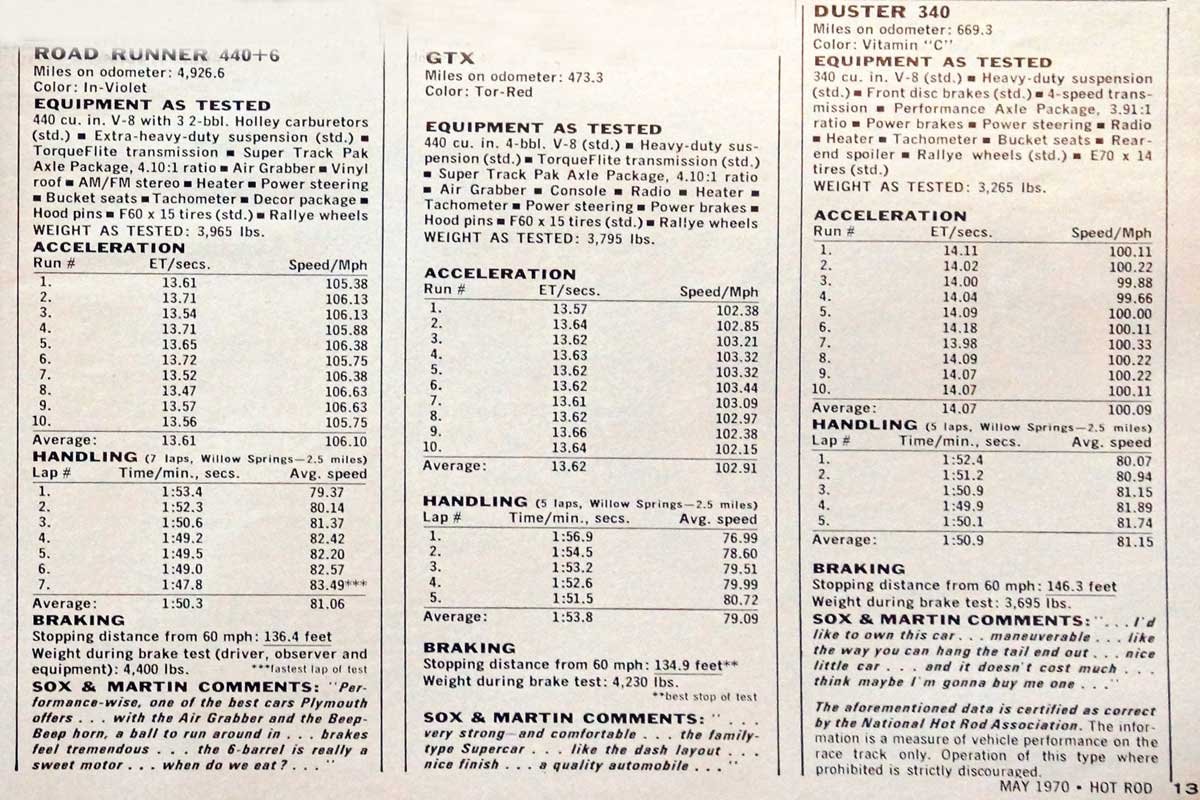 Above Left: The first three vehicles tested were the all-new Plymouth ‘Cudas. Sox evaluated a 4-speed 340 and a Torqueflite shifted 383 and 426 Hemi. Above Right: The second three vehicles tested were a 440+6 Road Runner, a 440 GTX, and a 340 Duster. The B-bodies were automatics, and the Duster was a 4-speed.