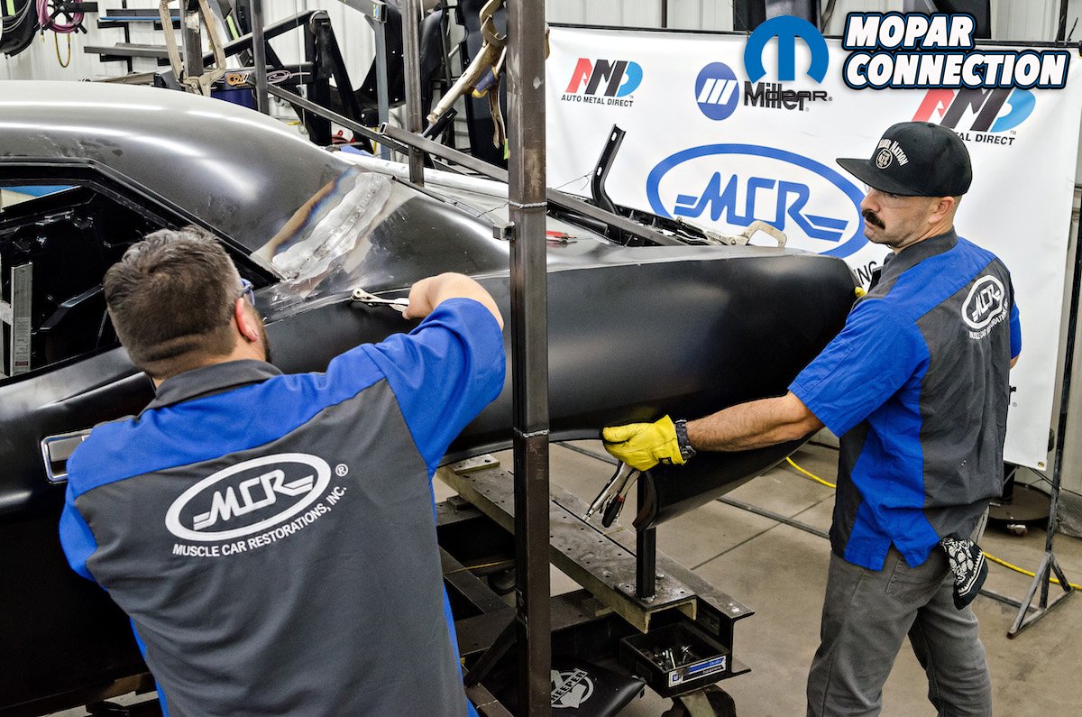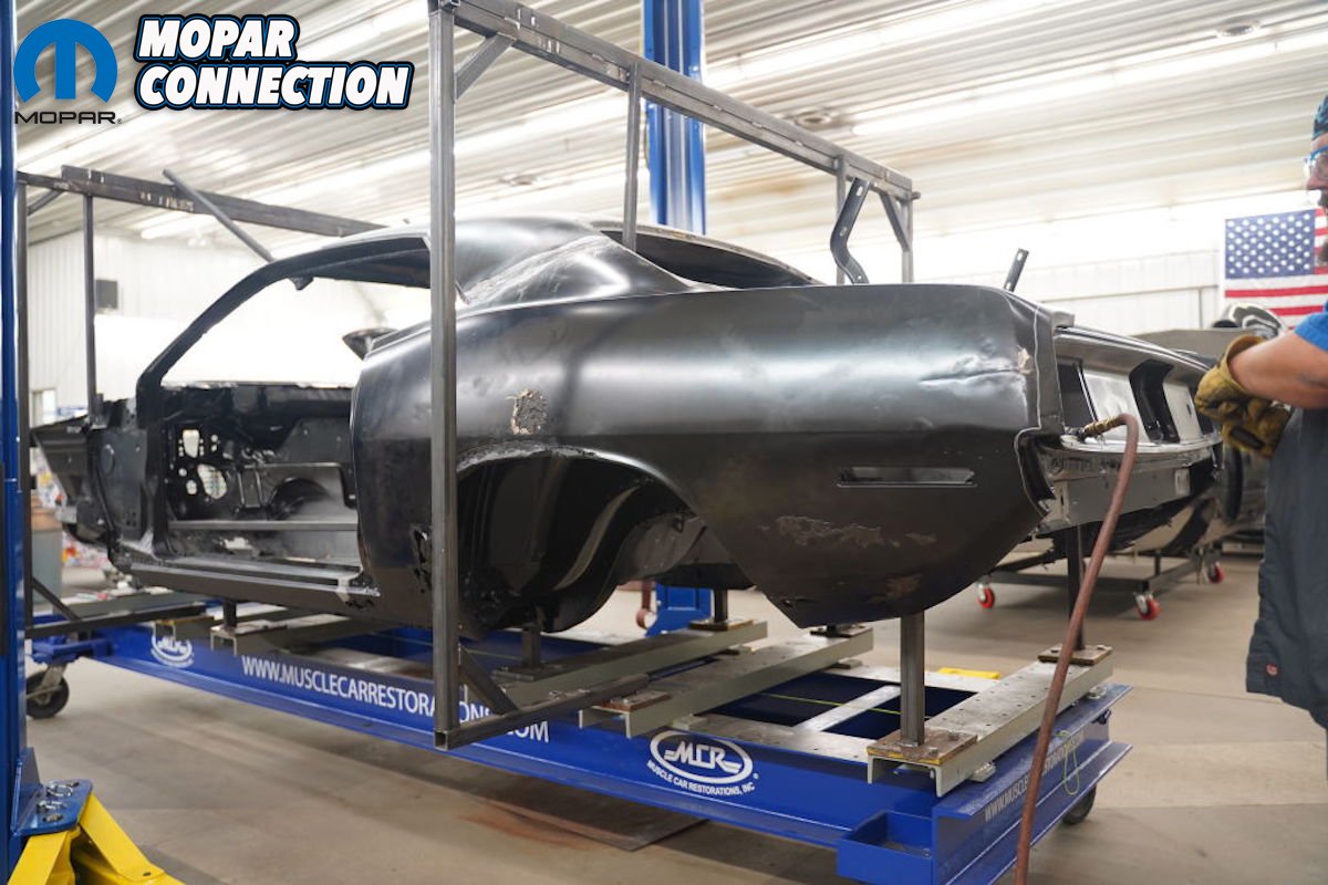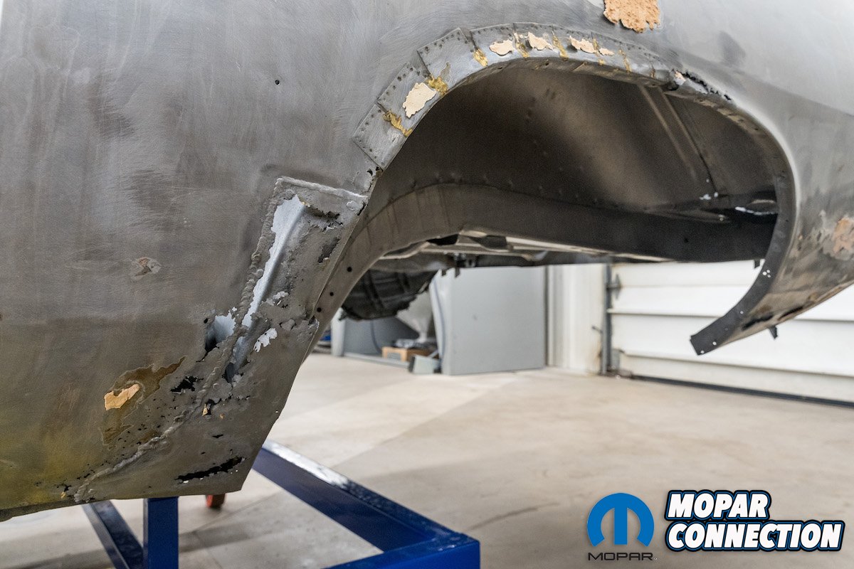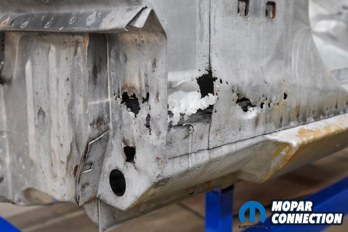 John’s ‘Cuda is fairly typical of the condition that MCR finds in most of the cars that come into the shop. Once back from being chemically stripped, extensive rust damage was found throughout the body. Now that the body is stripped completely naked, the team in MCR’s metal shop can accurately determine what will be needed to put it all right again.