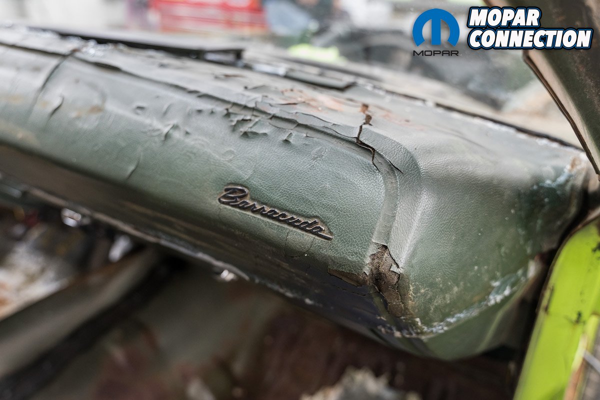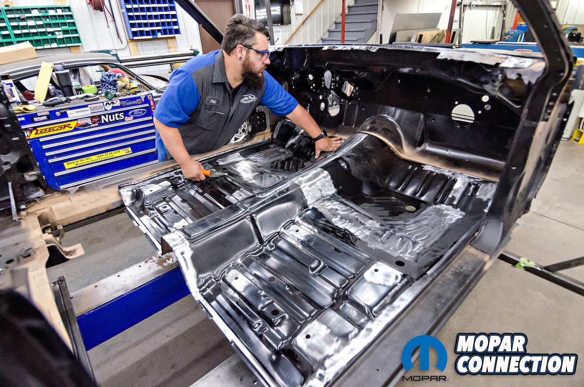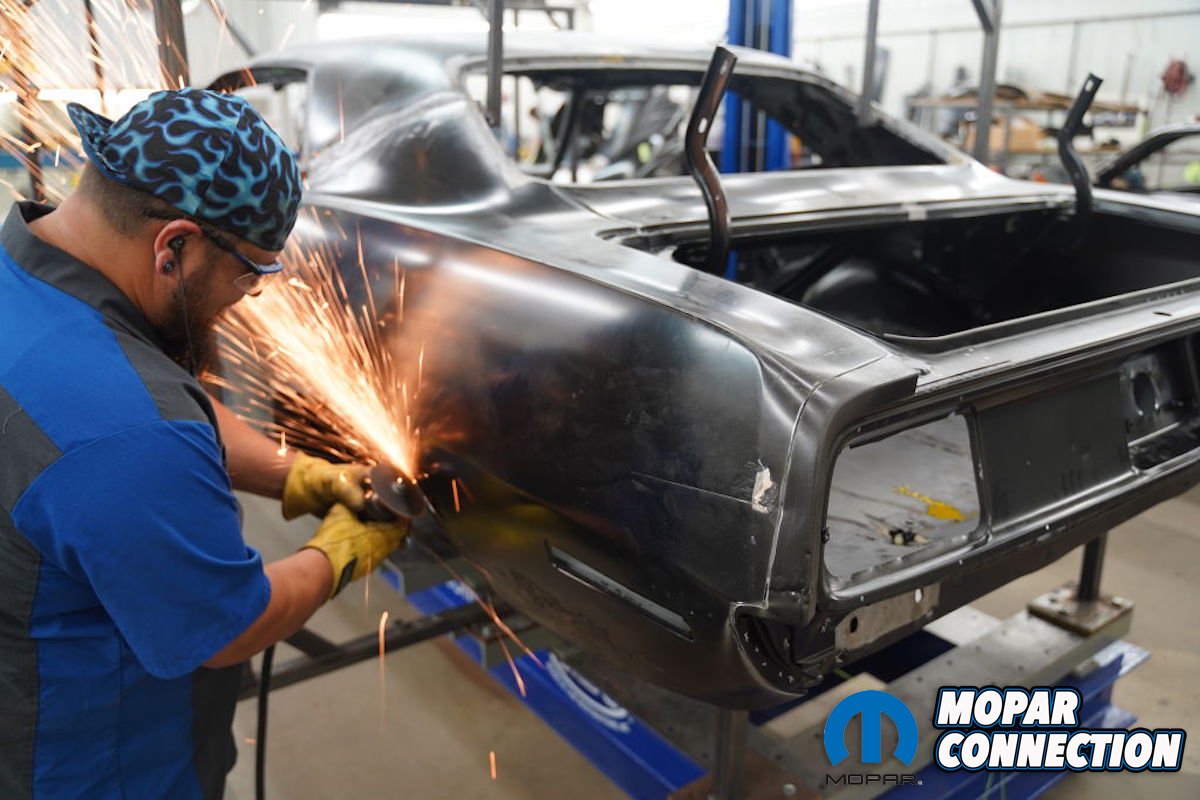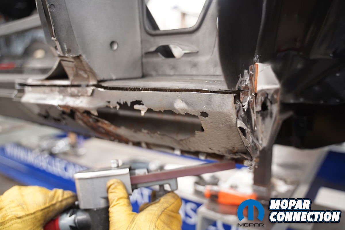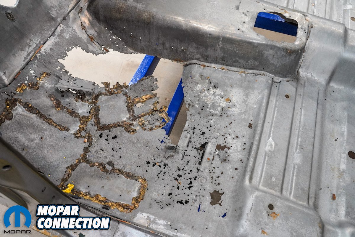 John’s ‘Cuda is fairly typical of the condition that MCR finds in most of the cars that come into the shop. Once back from being chemically stripped, extensive rust damage was found throughout the body. Now that the body is stripped completely naked, the team in MCR’s metal shop can accurately determine what will be needed to put it all right again.