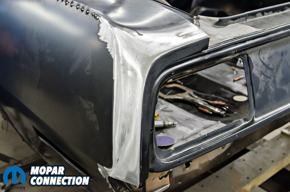Above left: Quarter seams are finished with a DA and barely need a skim coat of filler to become invisible. Above right: Sometimes rust is not just hidden under excessive body filler, sometimes it’s hidden under other body panels. This damage was only revealed after the roof skin was removed. Since the damage is very localized, fabricating a new part is the most efficient way to go.