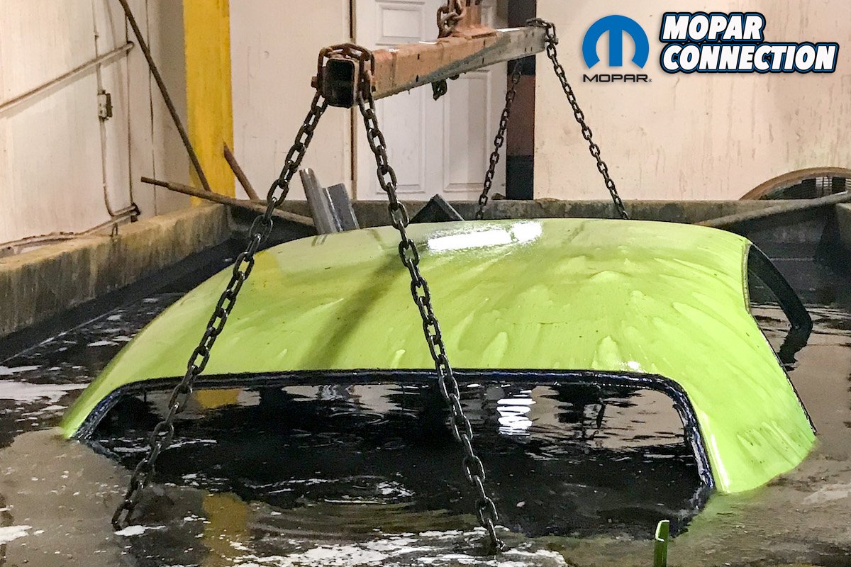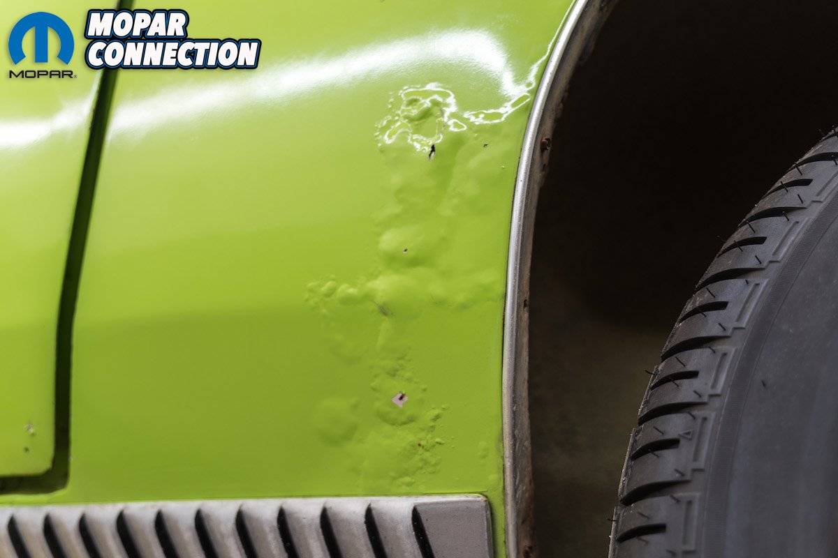Above left: Obviously there is some rust damage about to come through the paint on this part of the quarter. Maybe it’s not too bad underneath. Above right: The only safe way to remove all the paint and body filler from the body shell is through chemical stripping. MCR uses an alkaline process that does not etch or harm the sheet metal in any way like an acid bath would.