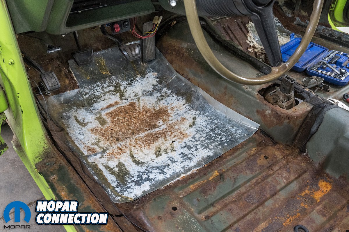Above left: Likewise, dash pads are usually damaged from exposure to the sun and John’s is no exception. Most are not this bad but even if it’s just faded or warped, it’s almost always best to replace it with a new one. Above right: This is never a good sign. With the carpet removed, this large patch panel was revealed. One can only imagine what’s hiding under it.