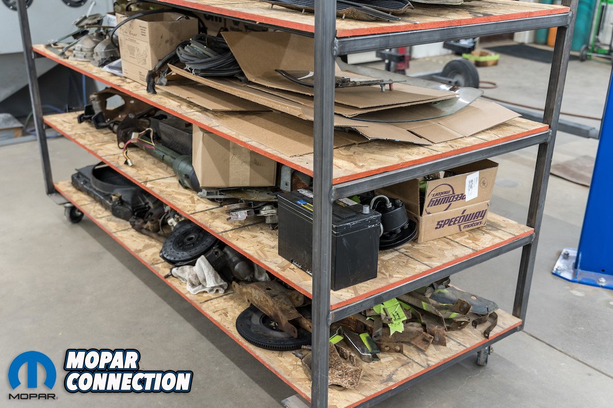 Above left: As each sub-assembly is removed, it is evaluated, photographed, bagged and stored. Everything is kept though not everything will be reused. The default is to always restore and reuse when practical but many times it’s simply more efficient to replace items that are accurately reproduced. Owner preference has the priority here. Above right: It’s vital that everything is kept together so each car has its own parts cart. This keeps everything in one location. Larger parts such as engines, transmissions, rear ends, hoods, doors, fenders etc. are labeled by owner and stored on warehouse style racks.