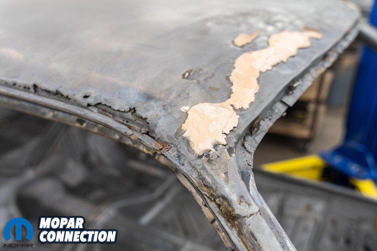 Above left: This damage was hiding behind the door and front fender so it’s tricky to spot this until the car has been disassembled. This will require a more complex multi-layer repair. Above right: This roof damage is a bit unusual. This top down sort of rust is most commonly found in coastal cars exposed to salt air. The roof, A-pillars, and drip rails will need to be replaced/repaired.