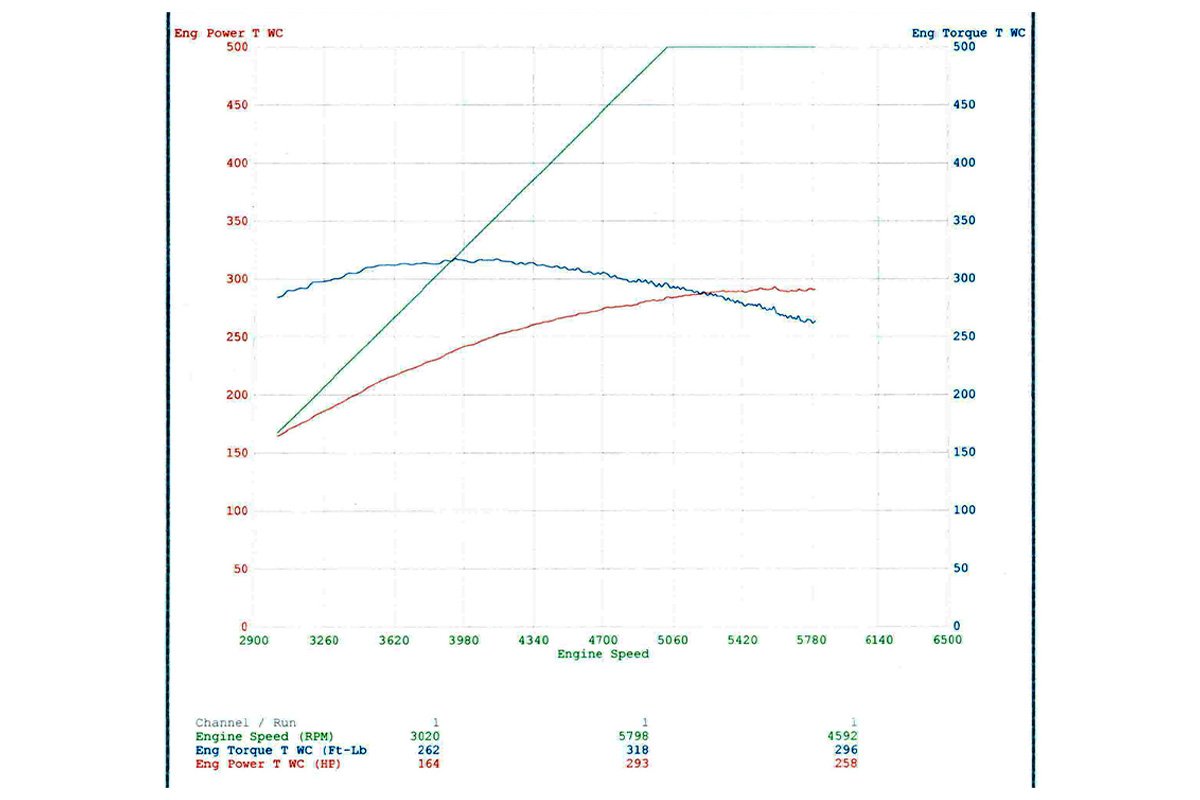 Above left: The beauty of a chassis dyno is that it allows the car to be driven under normal or even extreme load conditions in the safety of the shop where everything can be closely monitored. Above right: MCR’s Mustang Dyno measures rear wheel horse power so of course the numbers will be somewhat less than those from an engine dyno but that in no way reduces the value of a chassis dyno’s ability to test and tune. With 318 pounds of torque and 293 HP measured at the rear wheels, John will have more than enough power to enjoy pretending like he’s twenty years old again.