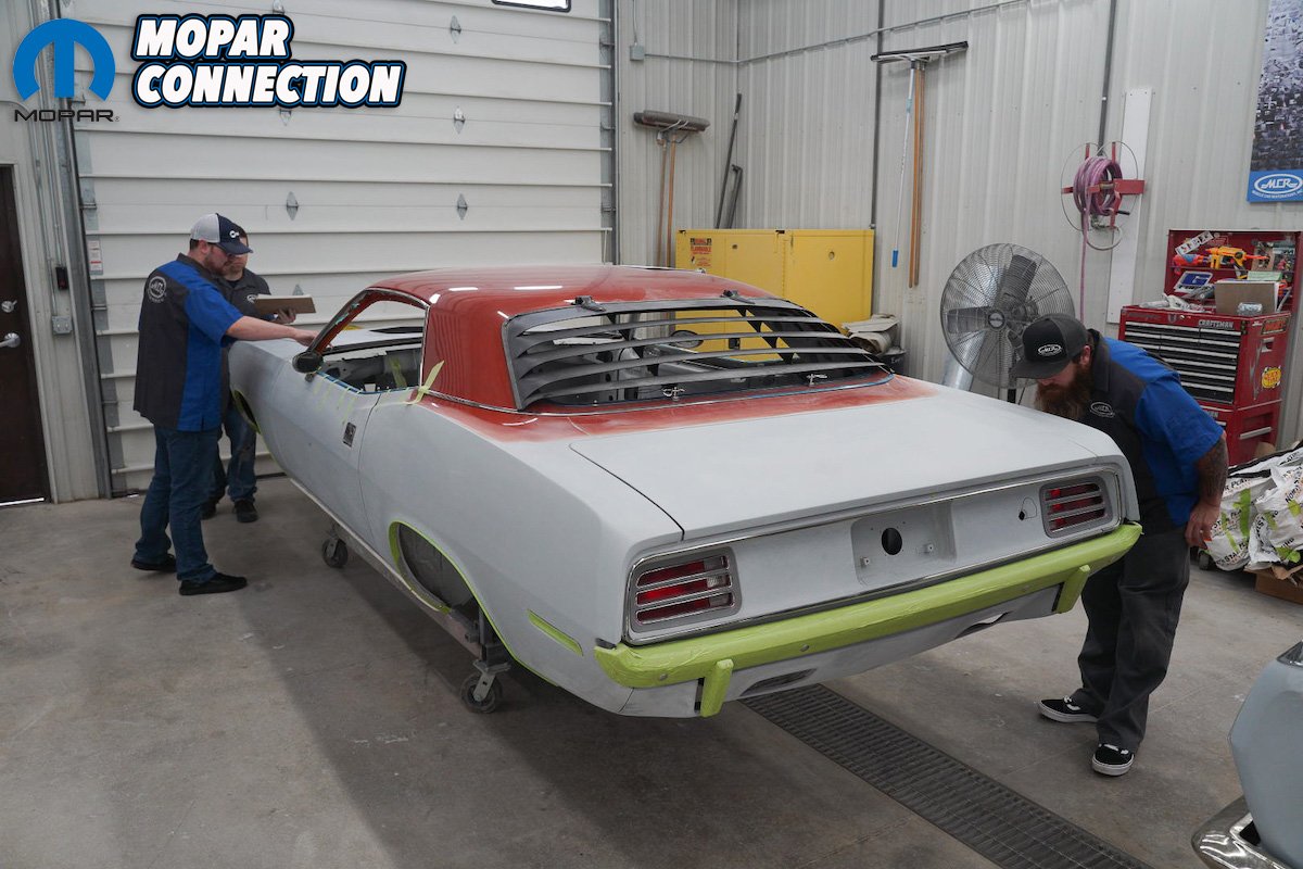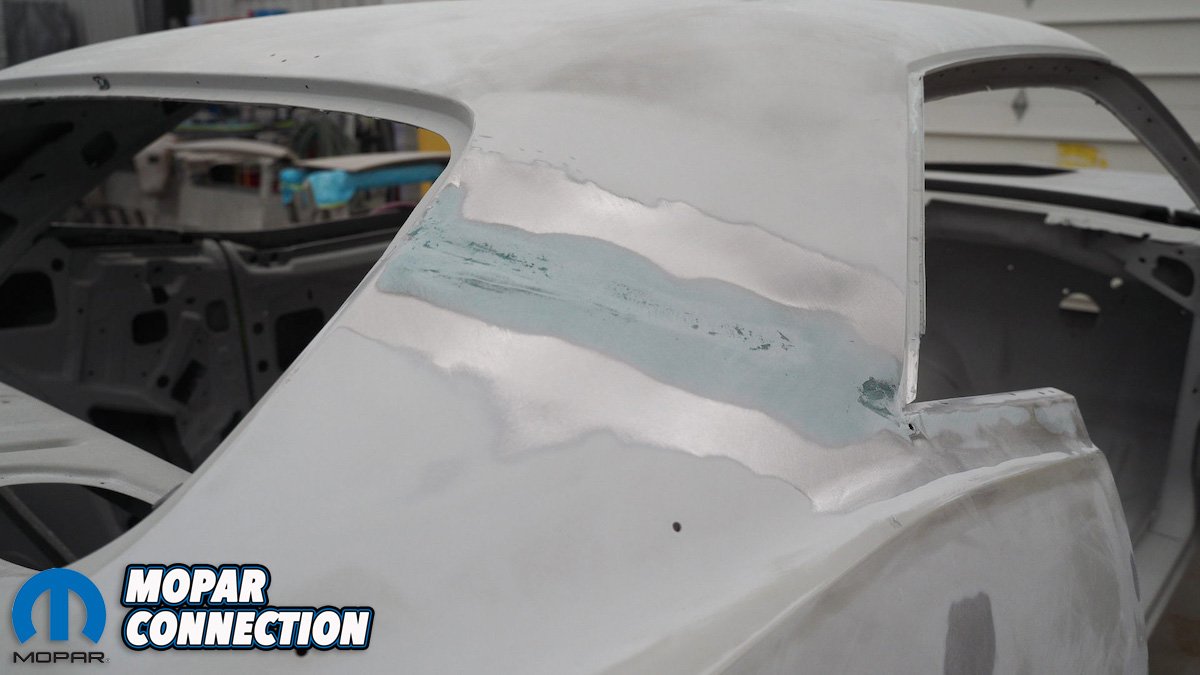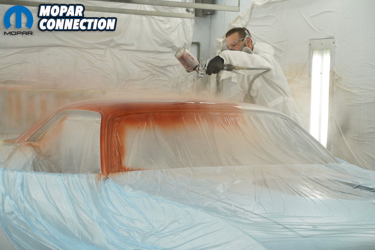 Above left: The roof area is sprayed with a single-stage paint as the normal base coat/clear coat is not needed under the vinyl top. Above right: The last critical step before paint is a mock up. All of the trim, taillights, bumpers, etc are installed and then inspected to be sure that everything fits perfectly. Following this, the final step before paint is a coat of DAS 3025 urethane sealer.
