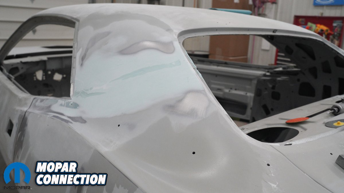 The next step is three coats of high-build PPG VP 2050 primer that is block sanded down to 320 grit to remove any orange peel. After which seam sealer is applied to all the factory locations around the body.