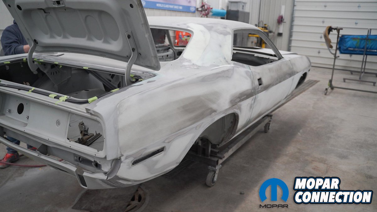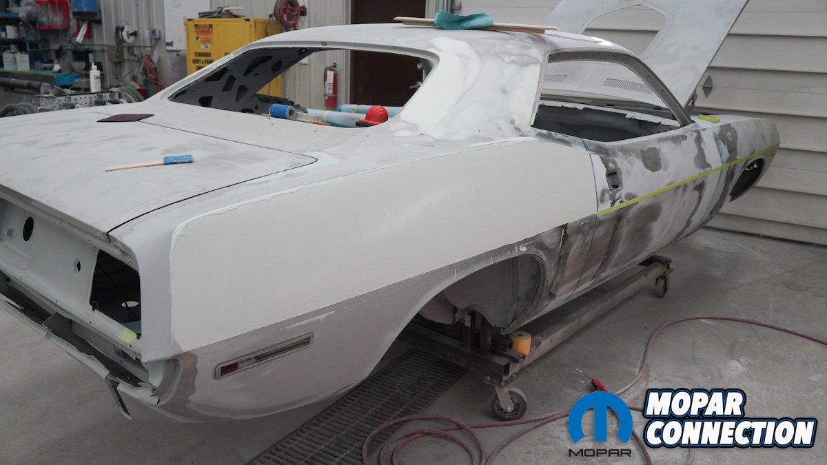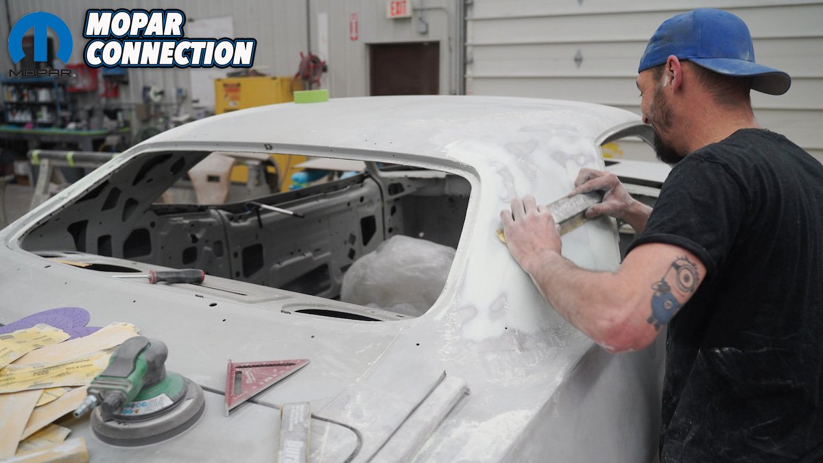 While this stage is often called “bodywork” that really is not a correct term as it brings to mind what is done in collision repair and that’s not at all what is done at Musclecar Restorations. Rather the entire car is skim coated with body filler and then the entire surface is block sanded to ensure that there are no high or low spots on any surface. Truth is, most of the filler material ends up on the floor and only enough remains to be sure the surfaces are absolutely flat.