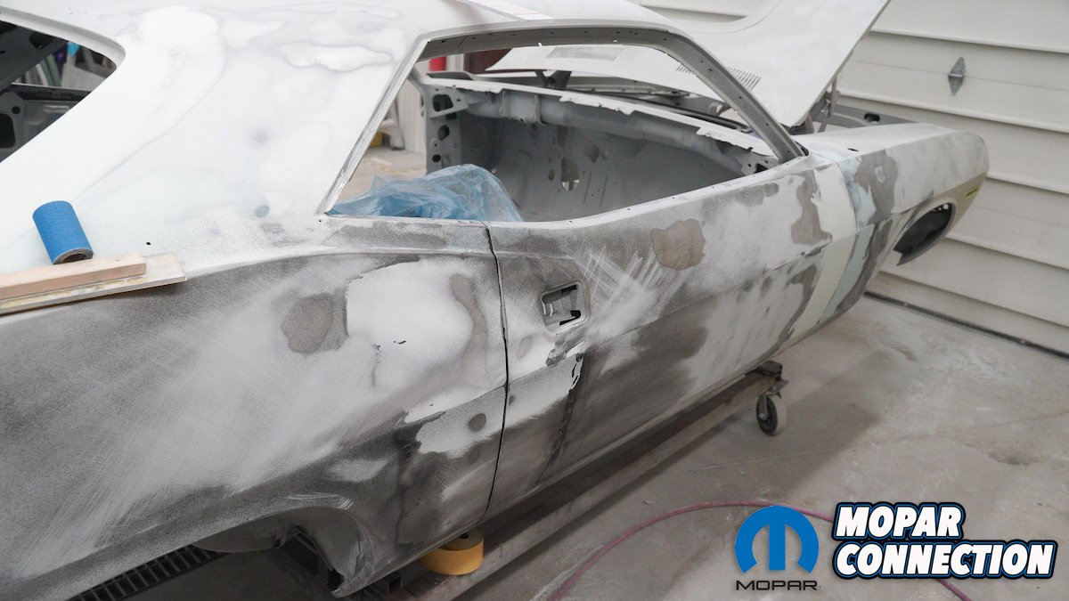 Above: The first step in the bodywork phase is to prime the whole car with DP50 LF and let it sit for seven days plus. The surface is then block sanded down to 120 grit, finished off with a Scotchbrite pad, and cleaned with SX.