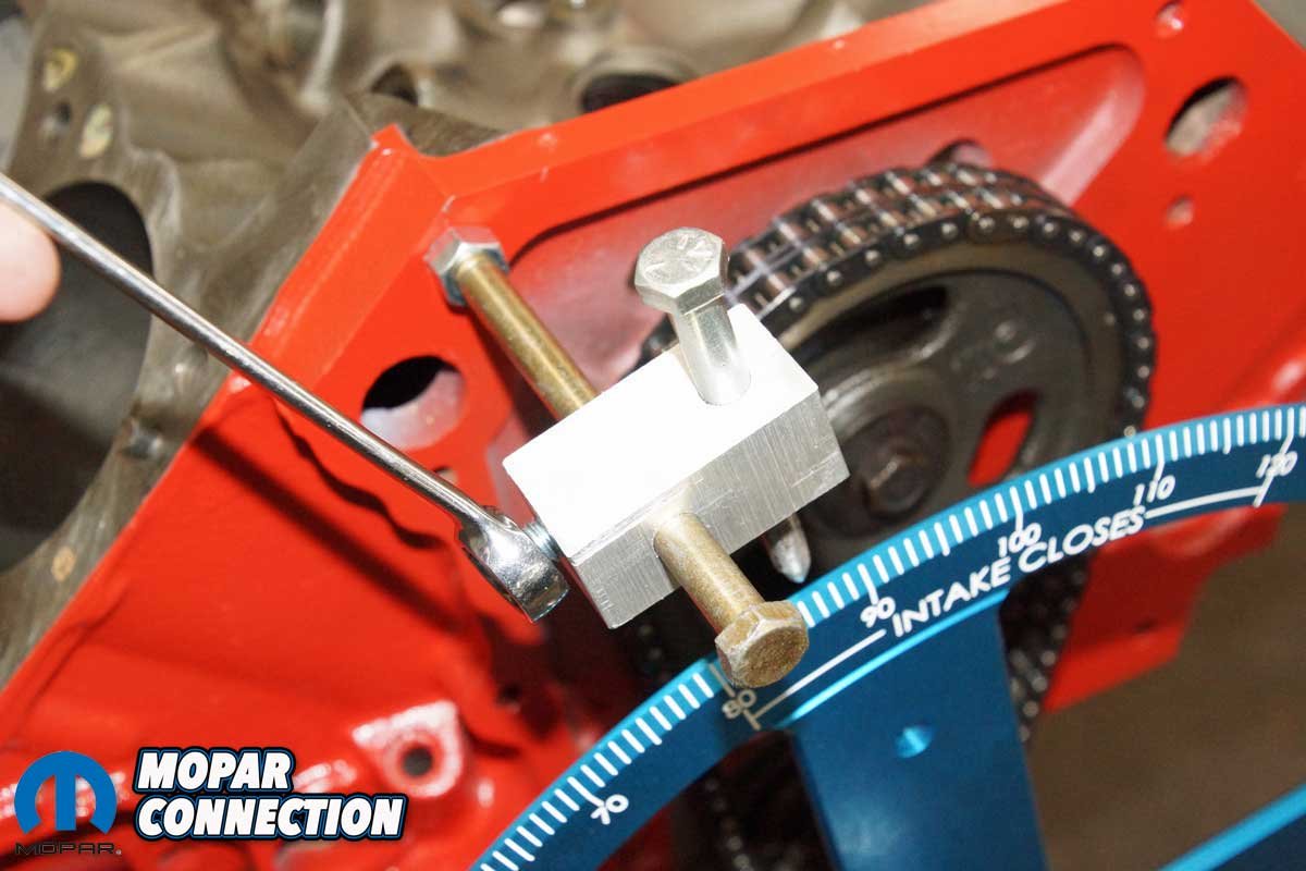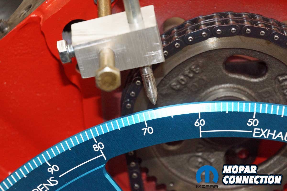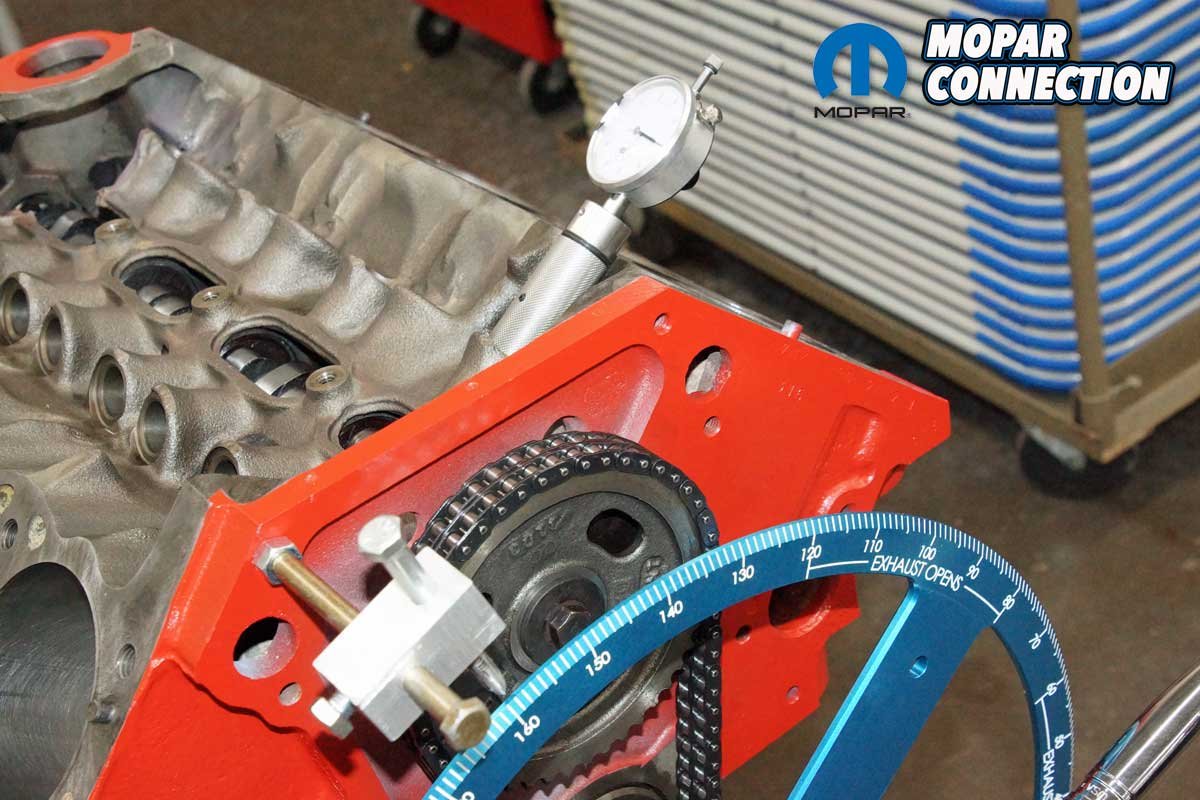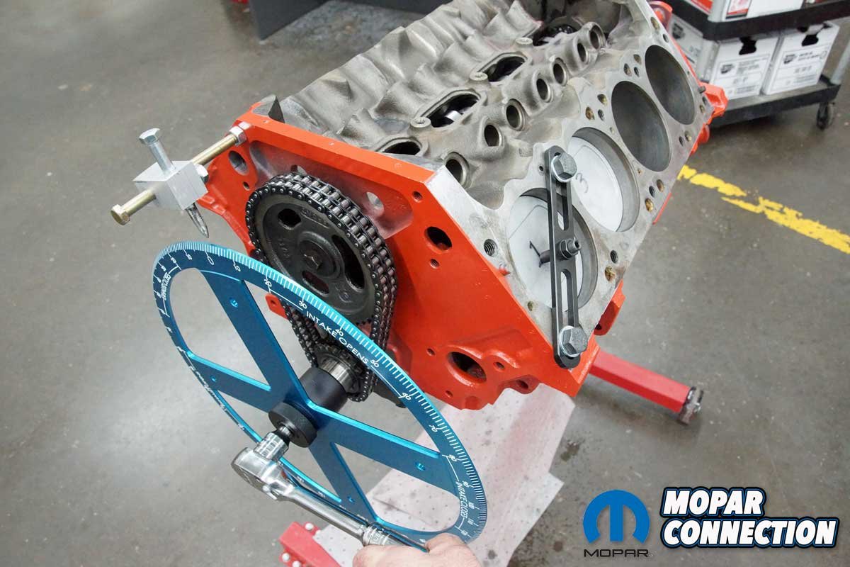 We removed the chain and the factory roller camshaft. Checking our inventory, we found a thirty-year-old unused Mopar Performance 0.557” lift mechanical cam and a new timing chain sitting on the shelf. After installing the cam and timing chain, we had an excellent short block for degreeing a camshaft.