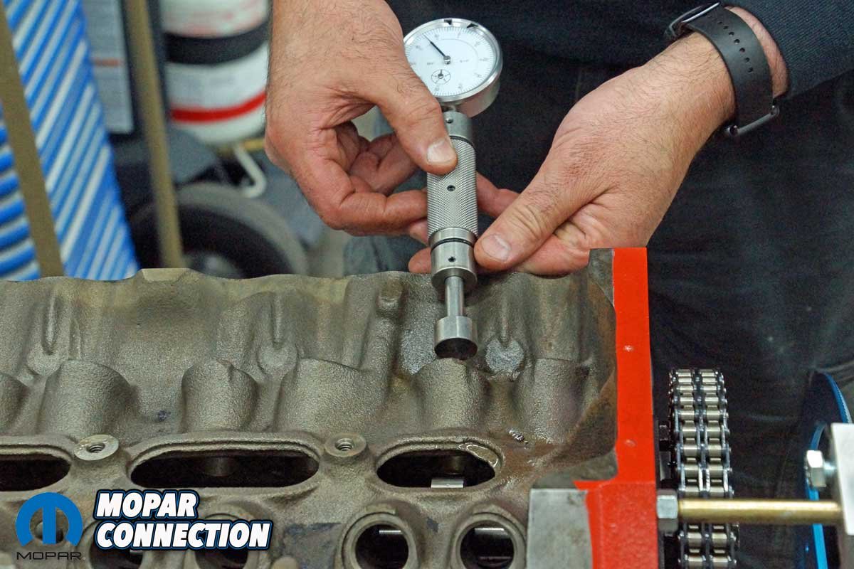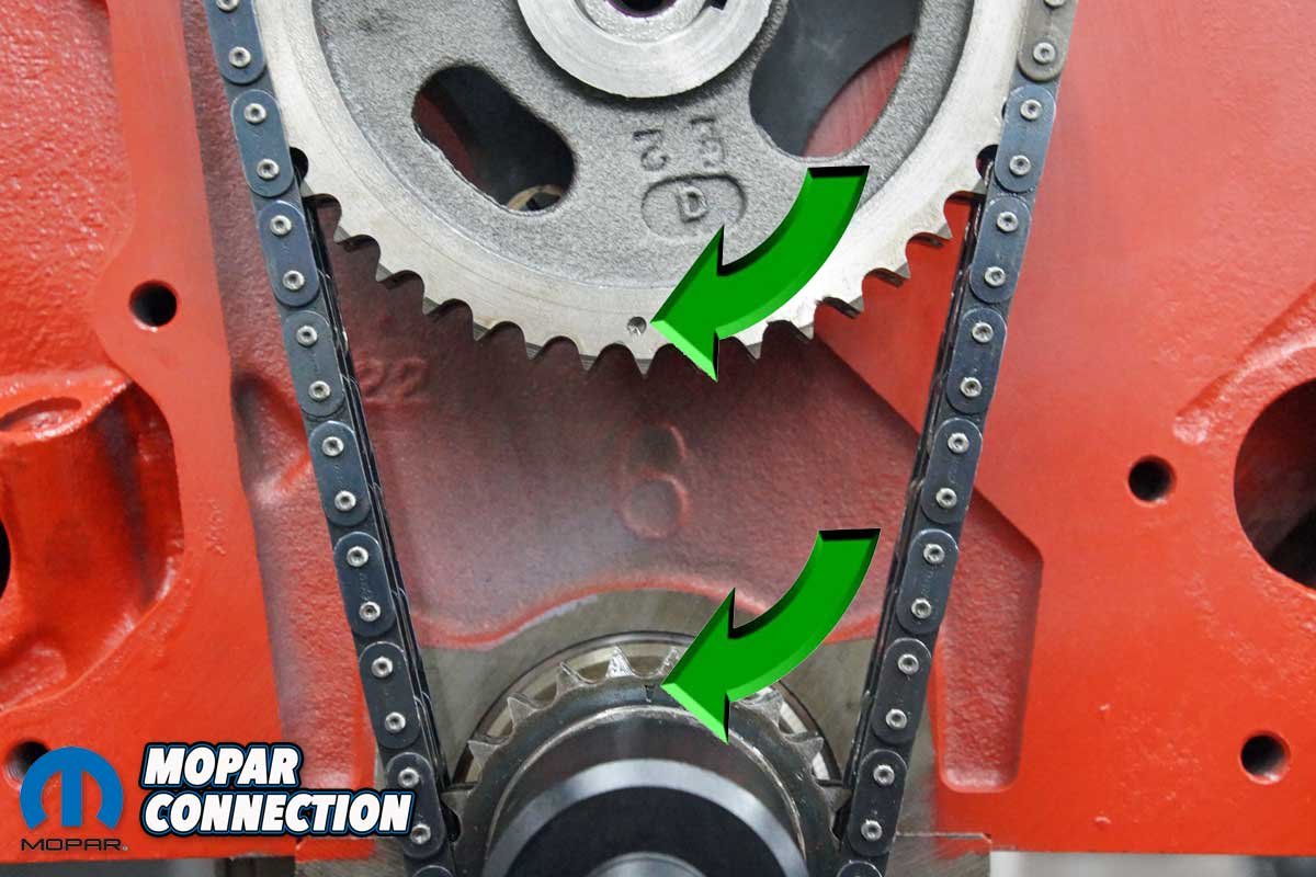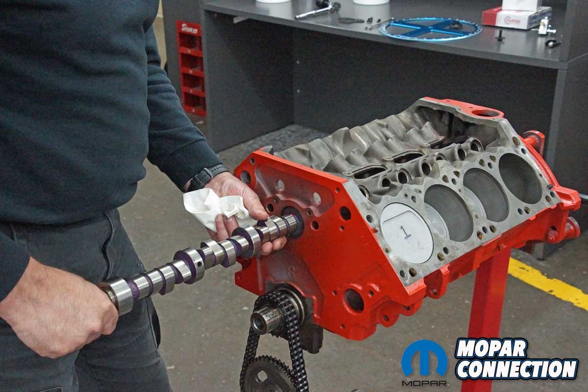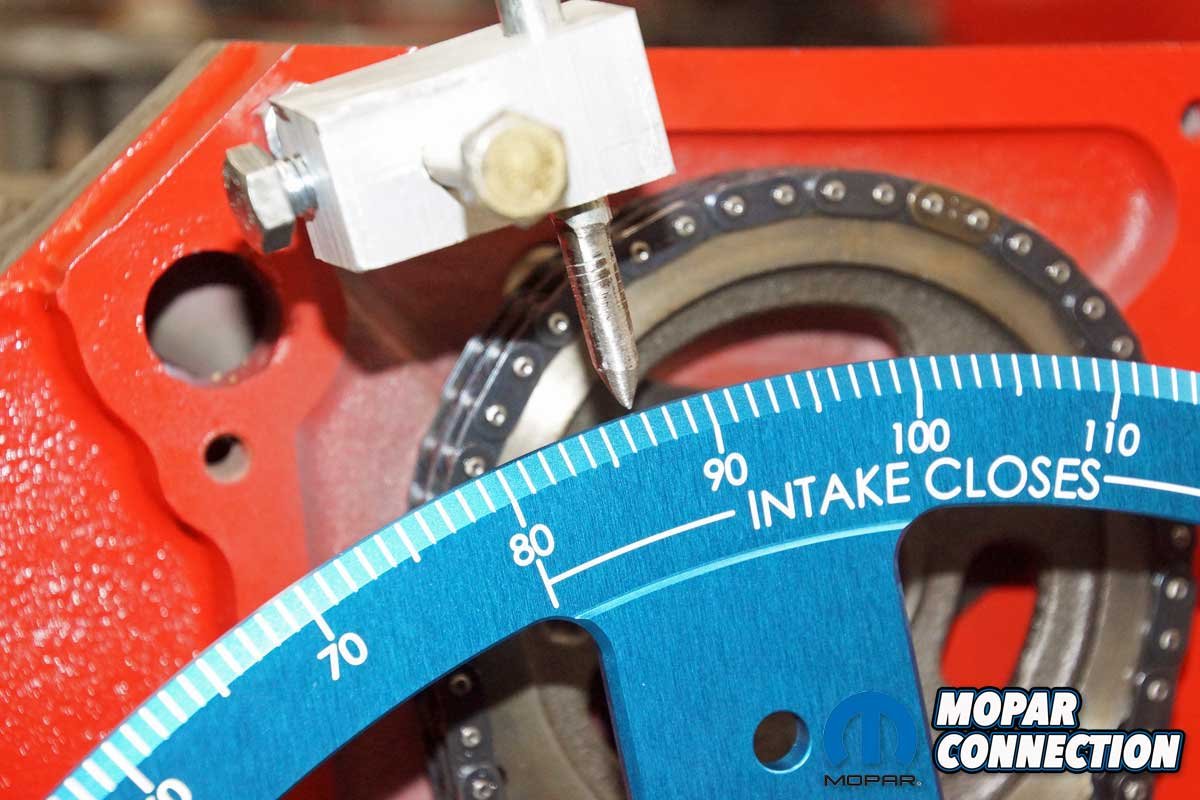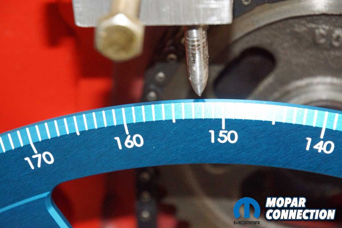 We removed the chain and the factory roller camshaft. Checking our inventory, we found a thirty-year-old unused Mopar Performance 0.557” lift mechanical cam and a new timing chain sitting on the shelf. After installing the cam and timing chain, we had an excellent short block for degreeing a camshaft.