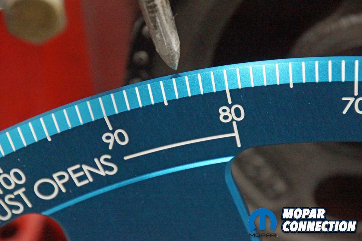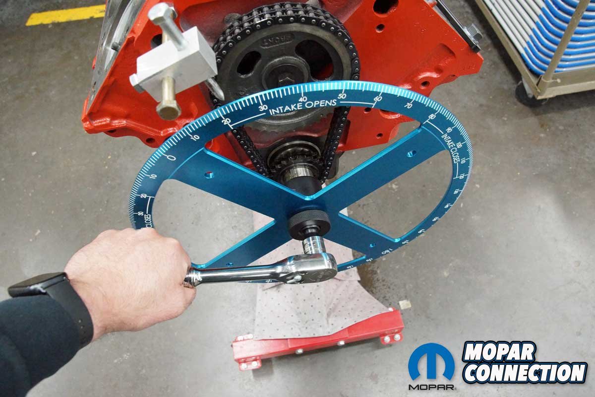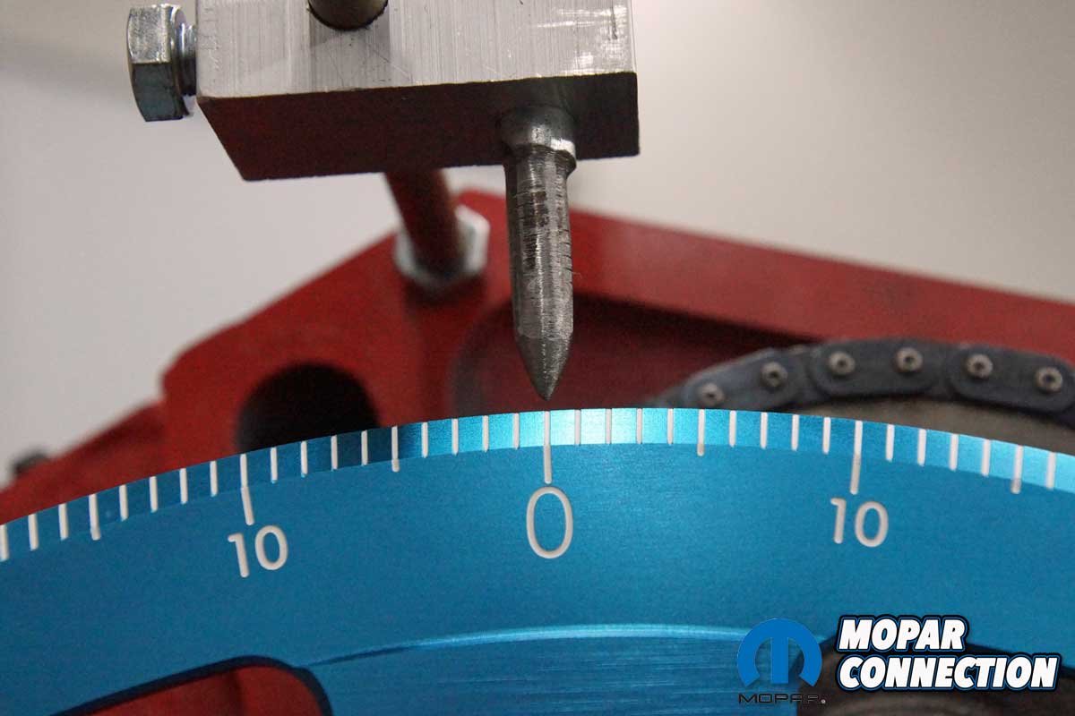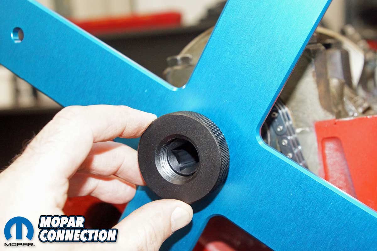 Top: To degree the camshaft, we collected a few tools from Proform Parts. We selected a pro crankshaft turning socket for Chrysler V8, a top dead center (TDC) locator, a cam checker tool for Chrysler V8, and a 16” aluminum degree wheel. Above Left: Before starting the camshaft degreeing, we installed a Mopar Performance camshaft and a new timing chain. Above Middle: The pro crankshaft turning socket has three different-sized keyways. We selected the correct one to slip over the crankshaft key. An Allen bolt secured the tool to the crankshaft. Above Right: The turning tool threaded lock was unscrewed, and the 16″ aluminum degree wheel was slipped over the threads. The lock was resecured to hold the degree wheel in place.