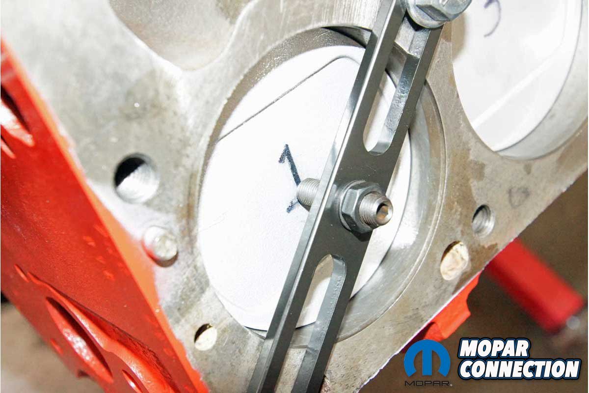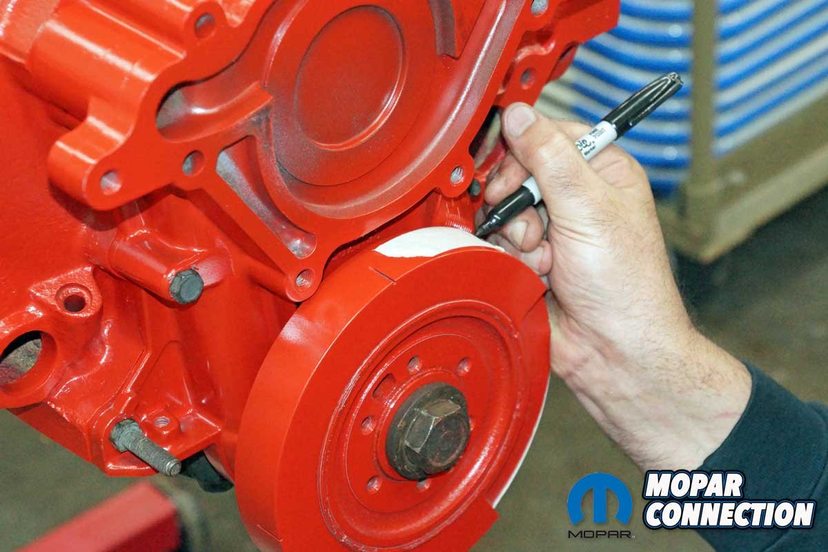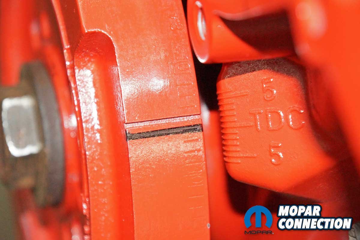 Satisfied with the results, we had one last test. With piston one down the hole, we reinstalled the piston stop and installed the harmonic balancer. The crankshaft was rotated until the piston made contact against the stop. We marked the balancer at the TDC mark of the timing chain cover.