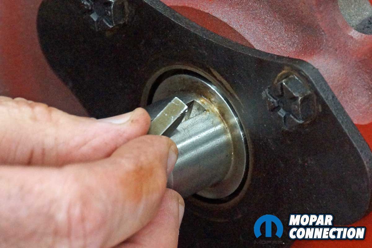 To advance the camshaft 2°, we had two options. One, use an offset camshaft key to dial in the camshaft, or two, advance the keyway on the crankshaft sprocket (if the sprocket had a three-key design). Seeing our crank sprocket was a three-key style and could advance the crank by 4° (2° at the camshaft), we selected that option. The adjustment required us to remove the degree wheel before the sprockets.