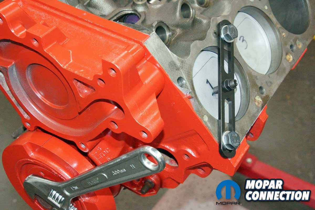 We turned the crankshaft until piston one was “down the hole.” With the piston out of the way, the TDC locator (piston stop) plate was secured to the block with two bolts threaded into the cylinder head bolt holes. The stop pin was screwed into the plate and locked into place with a locknut.