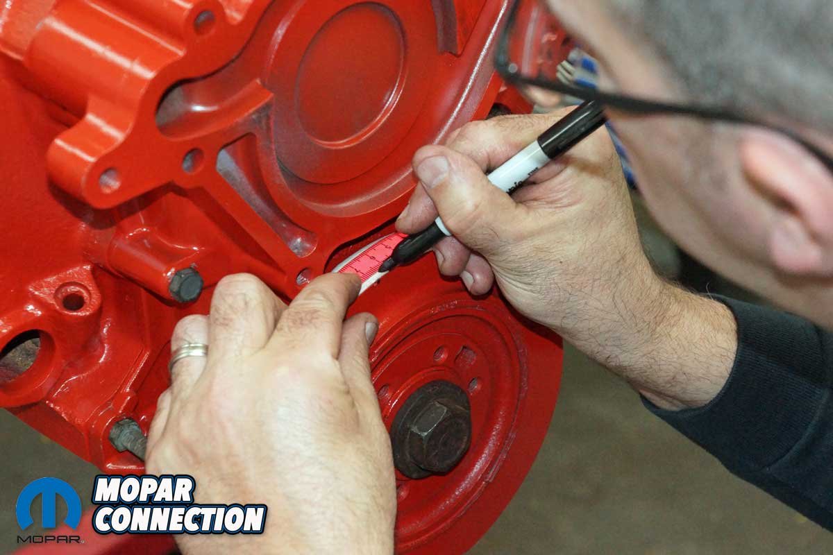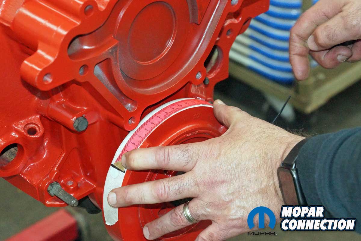 The crankshaft was turned in the opposite direction until the piston contacted the stop pin. Again, we marked the balancer at the TDC mark. The two marks were measured, and the point between the two was TDC. It turns out our used balancer was retarded by one degree.